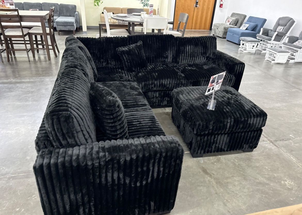 Brand new black fur like corduroy Sectional Sofa with Ottoman and 2 accent pillows.