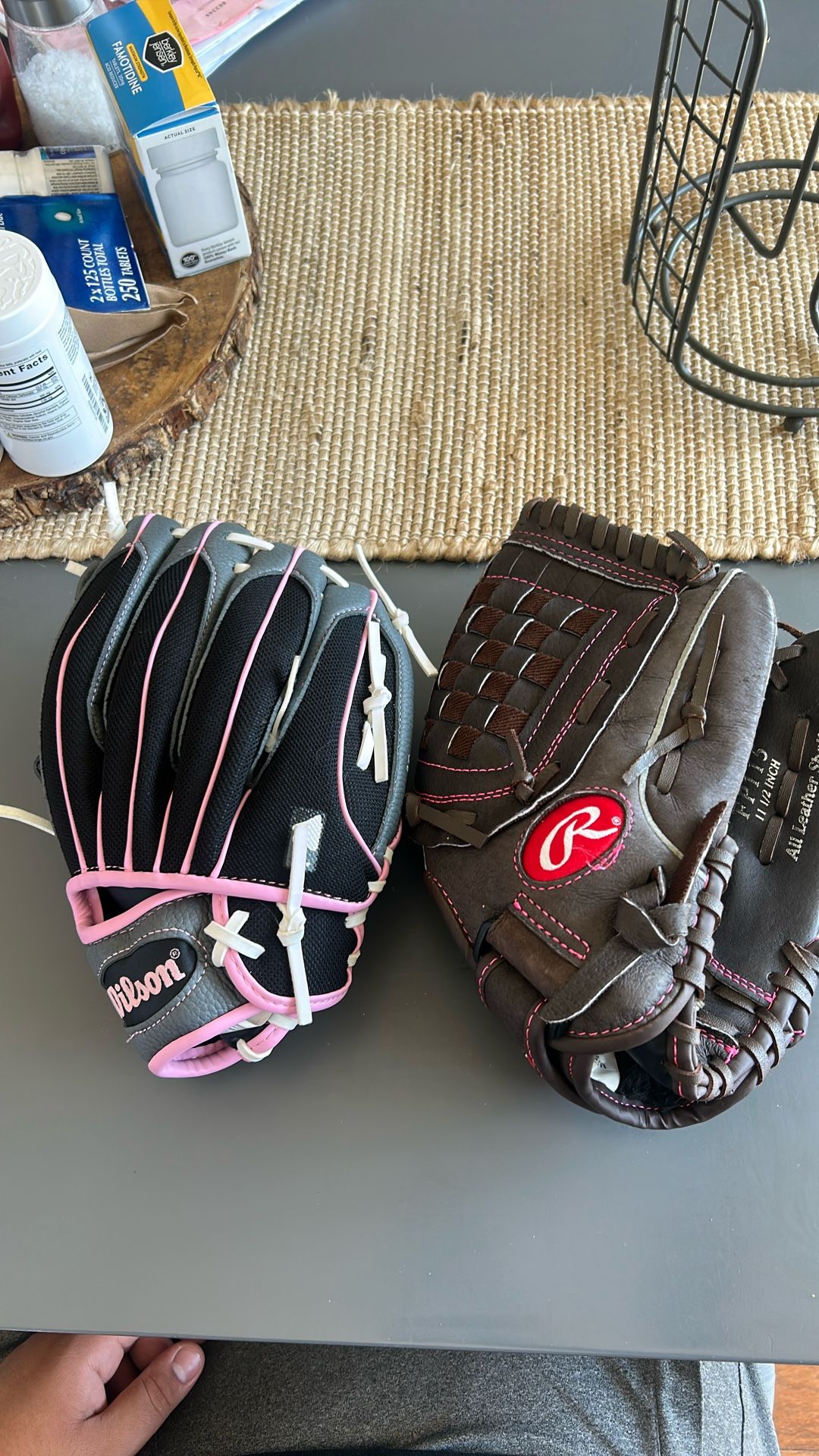 Wilson pink 10 1/2” right handed Fast pitch soft ball 11 1/2 inch Good condition Rarely used These gloves or for little girls