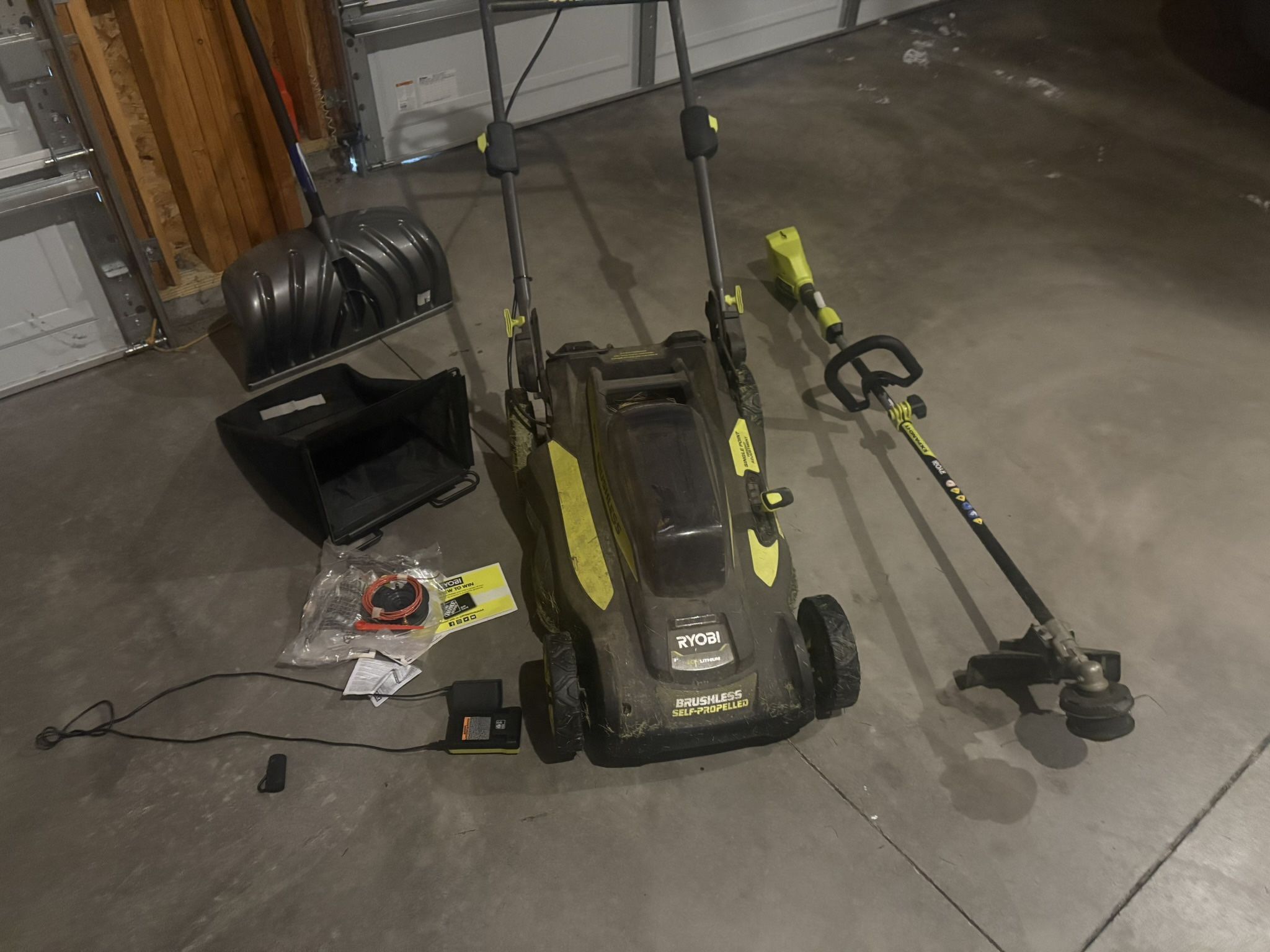 Includes: -Mower -Weed eater -Bag attachment -2 Batteries -2 Battery Chargers - Additional wire and tools
