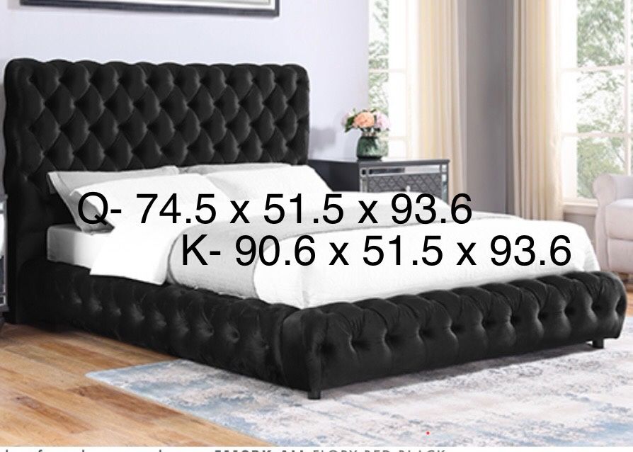 New sealed queen size black luxurious velvet tufted all around platform bed with new orthopedic medium firm bamboo top spring mattress included Delivery services $ COD Assembly available $ Financing available Hablamos español