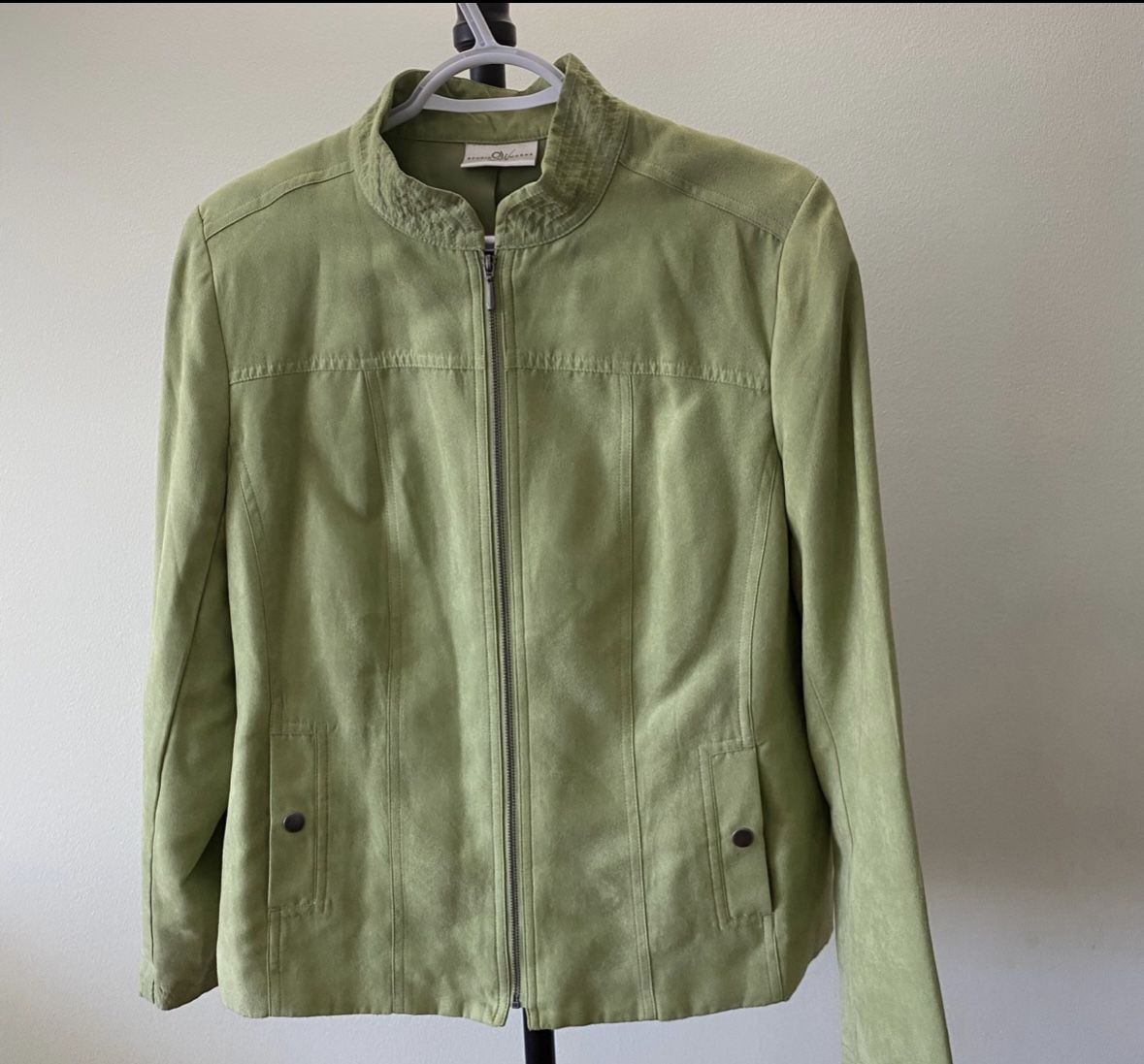 In great condition Studio Works faux suede jacket Color LIME GREEN Size 14 Functional pockets (snap closure) Slightly padded shoulders Full zip Lined Shell: 100% Polyester Lining: 100% Polyester
