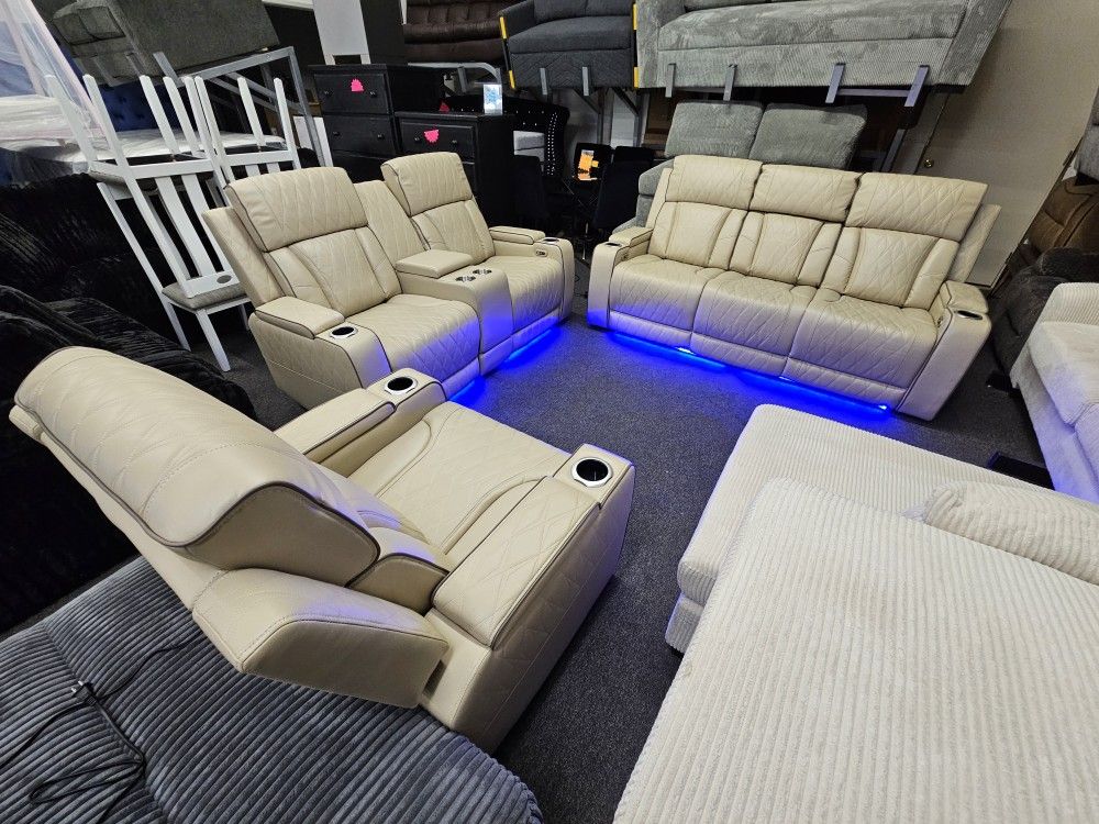 Super Deal 3 Pcs Sofa Power Recliners Sofa, Love Sear & Chair Cream Faux Leather LED Light Wireless Charger Trade Lift Up Reading Light Storage Arms Storage Love Cup Holder USB & Type C Outlet $1899 + Tax Elis Fur Finance Available 3 Months Same As Cash 11 to 7 Pm