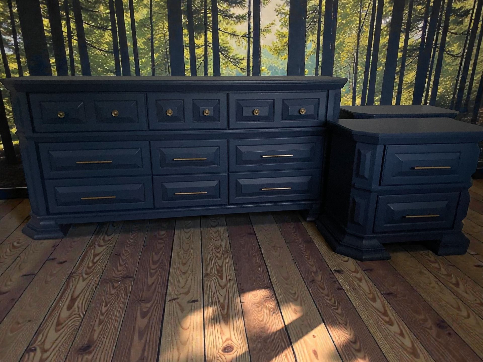 Restoration Station’s newest production. This one of a kind Lexington pine set has been restored in dark navy satin. Nine perfect working drawers, solid wood, New modern hardware. Dresser 76x19x34, Nightstands 30x18x26 Delivery Available Like this color? We can also transform any furniture you may have, any color, most styles.