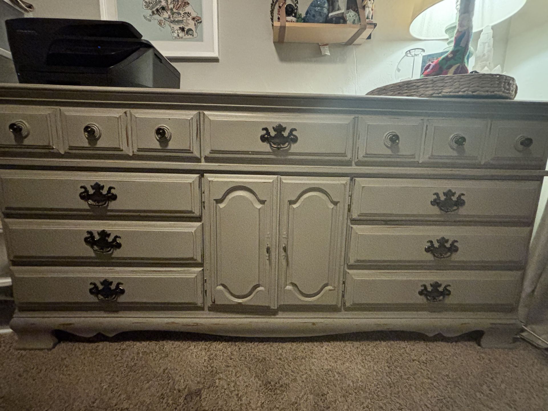 Beautiful solid wood dresser in great condition and ready for a new home! We use it as a dresser, but it would also make a gorgeous buffet or hutch in a dining, living, or family room. • 9 fully functional drawers • Freshly painted soft gray with vintage-style hardware • Sturdy solid wood construction • From a smoke-free home 📏 69”W x 34”H x 19 1/4”D 💡 Decor not included Local pickup only. Cash or Venmo preferred. Message me with questions!