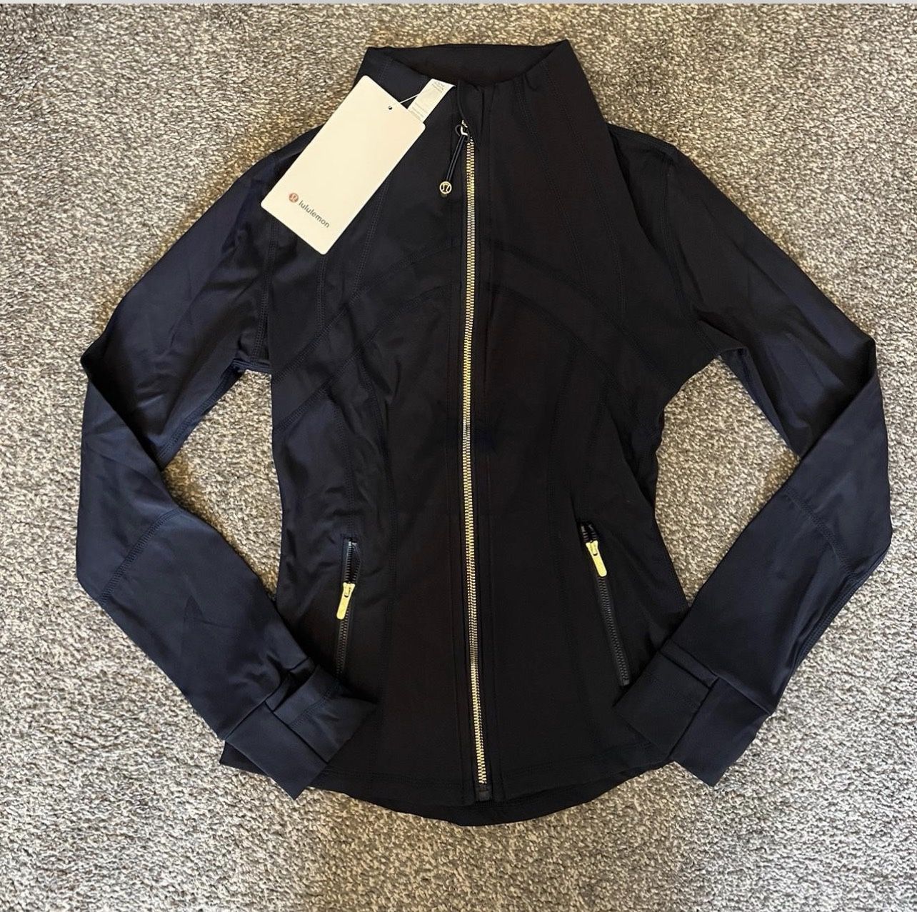 Sleek black Lululemon zip-up jacket with gold zipper accents, sculpting seams, and cuffed sleeves. Lightweight, four-way stretch fabric delivers comfy, sweat-wicking performance for workouts or everyday layering in any season.