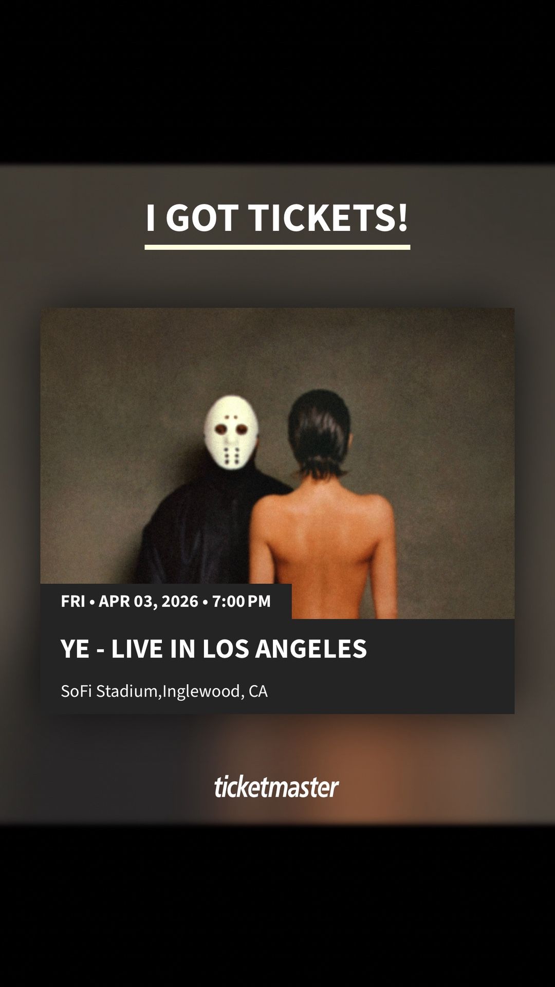 2 Kanye tickets for LA concert 4/3/26 Sections 202 row 8 $600 each