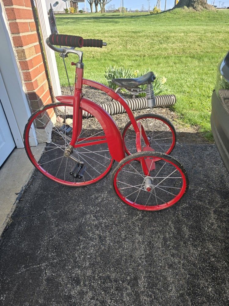I was told this was a 1930's skippy tricycle it has the head badge saying skippy good over cond for age it needs a total restoration it was painted red not a good job and tires are shot hard rubber this is rare tricycle it would look awesome redone thanks asking 225.00