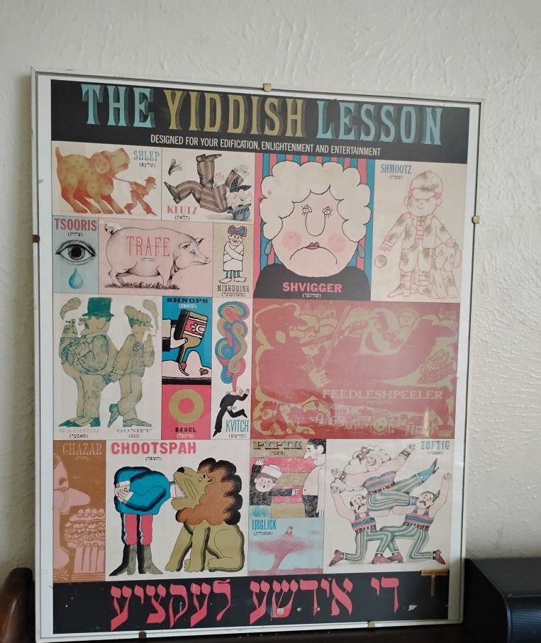 This framed item is a vintage "The Yiddish Lesson" poster designed by artist Lionel Kalish.