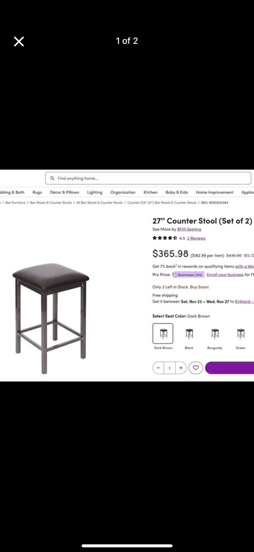 Two classic style bar stools, metal legs with dark brown faux leather tops. Counter-height (27") Very comfortable. Current retail price is $365+tax on Wayfair. Brand new and lovely, but the legs are uneven so the stools can rock (one stool more than the other). Each leg has a small clear plastic bottom - maybe that part could be replaced to level them? Selling for 1/10th of retail price - $35 takes them both. Easy porch pickup in Kirkland near the boys and girls club. Delivery available with pre-payment, within a reasonable area.