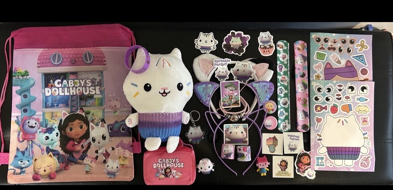 Gabby Dollhouse 30PC Gift Set Gift set includes the following….. x1 27x34cm Drawstring Gift bag backpack x1 25cm Medium Plushie x1 Acrylic Key ring x1 Layered photo bracelet x1 Coin purse x1 Silicone bracelet x1 mini led glow flashlight x2 button Pins x2 mini figures x2 photo stickers x3 Cat ear headbands x3 Temporary tattoos x3 slap bracelets x8 stickers Please keep in mind that some items in bag will be different as pictured. You will receive as listed and everything will be Gabby dollhouse items. Photo can be sent upon request. Fast shipping