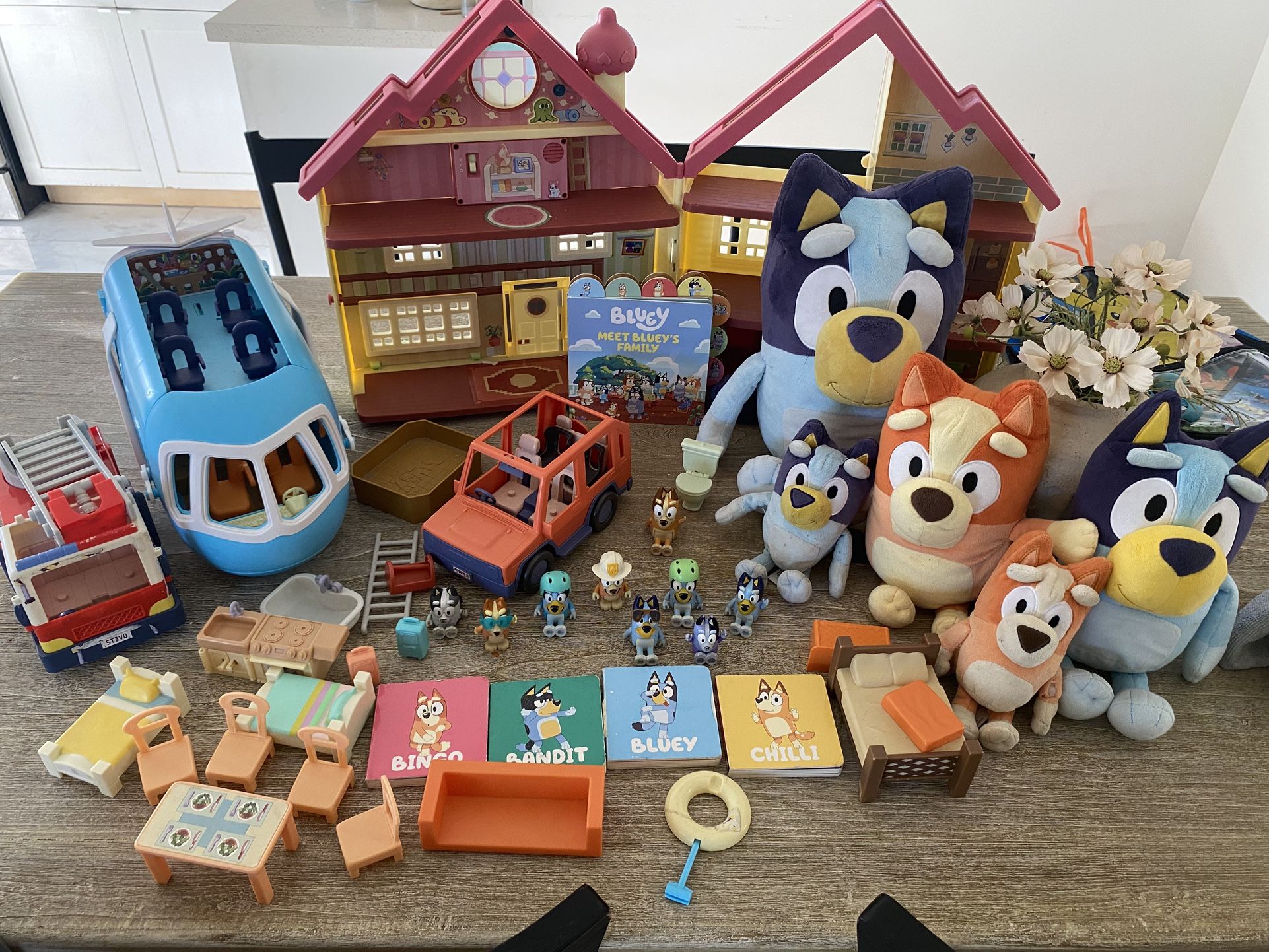 Bluey toys 110 for everything. Or specific toy message me they’re in great condition. Airplane, fire truck, house, books, plushies, two of the plushies bingo and Bluey talk, Bluey figure toys