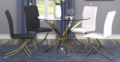 Gold Brass Contoured Asterisk Table Base with a Glass Top *4 Chairs - White and Black 46” dia x 29.50"H Best Prices in the Industry Guaranteed! *No Tax *Pickup in Tracy by Appt *We Can Deliver