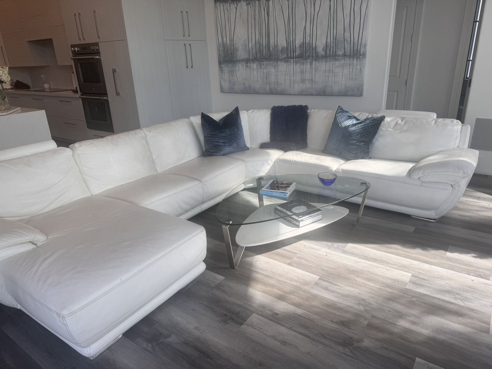 Beautiful gently loved white leather couch with lounge … timeless , modern , comfy! 3 pieces easily accessible, durable, comfortable,