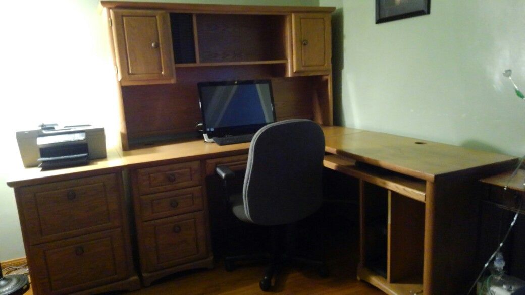 Oak shelf with cabinets,desk with 4 drawers, side table with pull out keyboard table, 2 each CD racks. Plus matching file cabinet item is not sold as ad says