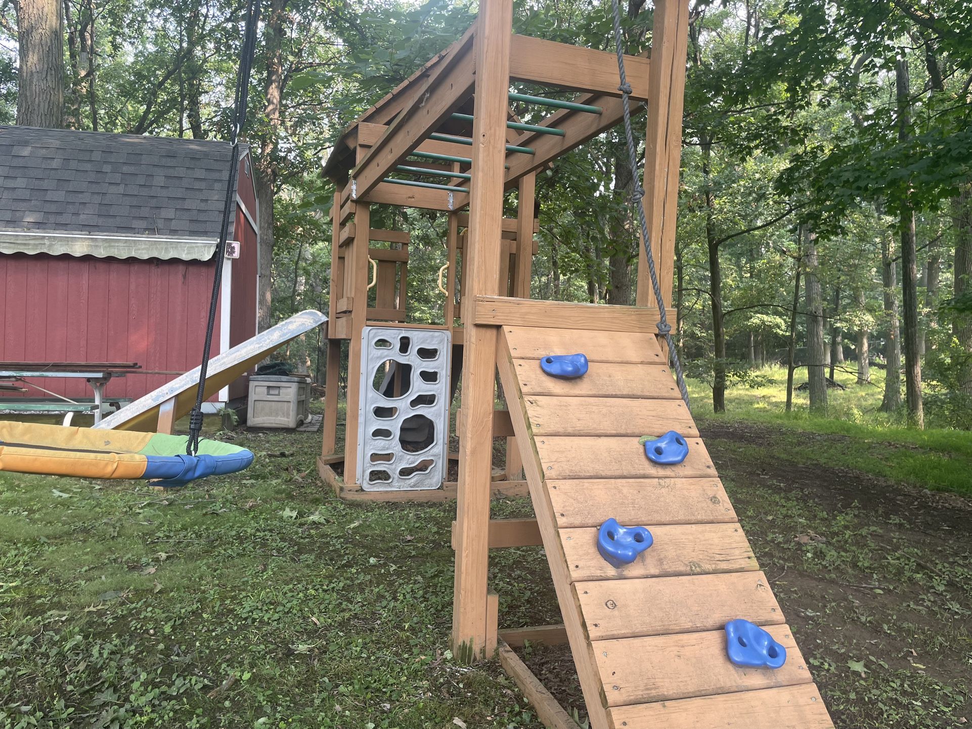 Slide, climbing ladder, oversized swing. Does accommodate 3swings , lookout tower