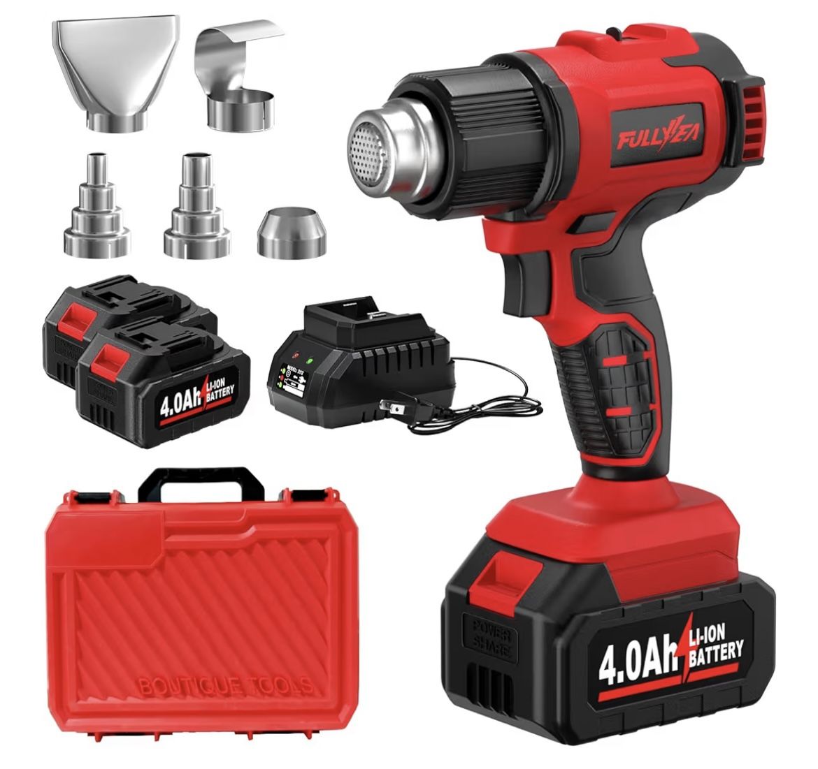 [ Powerful & Fast Heating ] -- Heat gun for shrink tubing has 2-temperature settings: High Temperature (H) for 1022℉/550℃ and Low Temperature (L) for 572℉/300℃. With a powerful and durable motor, the heat gun cordless can heat up quickly to meet your multi-use needs. [ 5 Types of Nozzles ] -- Hot air gun kit is a complete set of accessories. It has 5 different types of nozzles, which can be used for shrink tubing, shrink wrapping, paint removal, DIY crafts and more. FULLYEA battery-powered heat gun is your ideal choice. [ 2*4.0AH Li-ion Batteries ] -- Heat gun for crafting is a high-powered tool, so we equipped it with 2 pcs 4.0Ah high-capacity batteries, which you can use alternately to extend your working time. You can easily use the mini heat gun anythere just by carrying batteries. [ Safety & Ergonomic Design ] -- Heat gun cordless is designed with safety lock to avoid accidental start and ensure safe operation. Ergonomic handle is comfortable to use. Air outlet is made of high-quality honeycomb stainless steel to ensure even airflow. [ Reliable Customer Service ] -- FULLYEA is committed to providing you with high-quality tools and ensuring your satisfaction. If you have any questions about this cordless heat gun, please feel free to contact us. Our customer support team is always ready to help you!
