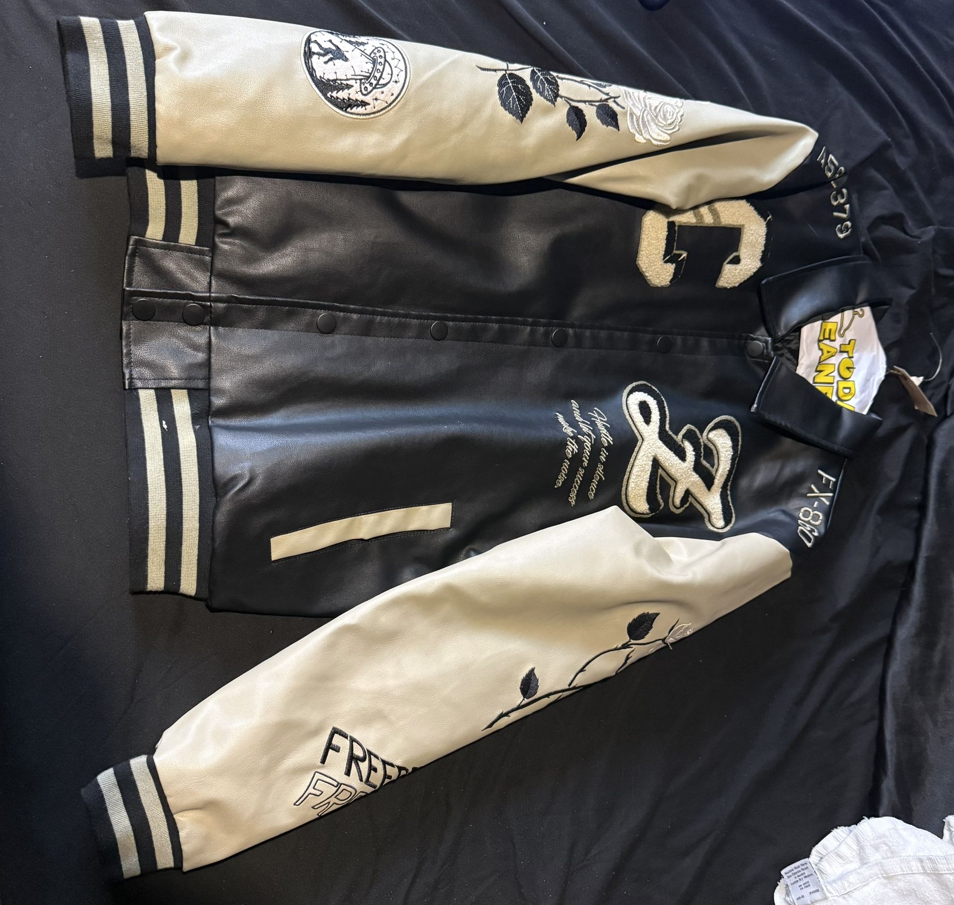 Selling this Ring of Fire "Paradise" varsity-style jacket in excellent condition. It features a high-quality vegan leather (polyurethane) shell with a comfortable quilted lining. Size: Men’s Large (L) Design: Embroidered white roses on both sleeves, "Freedom" graphic, and "UFO/Bigfoot" patch detail. Details: Classic snap-button front, striped ribbed cuffs and waistband, and chenille "C" and "Z" chest patches. Condition: Barely worn, no scuffs or peeling on the leather. I got it professionally cleaned at Today’s Cleaner :) Great streetwear piece with a unique fresh look. Asking $40. Pick up in Bakersfield or can ship!
