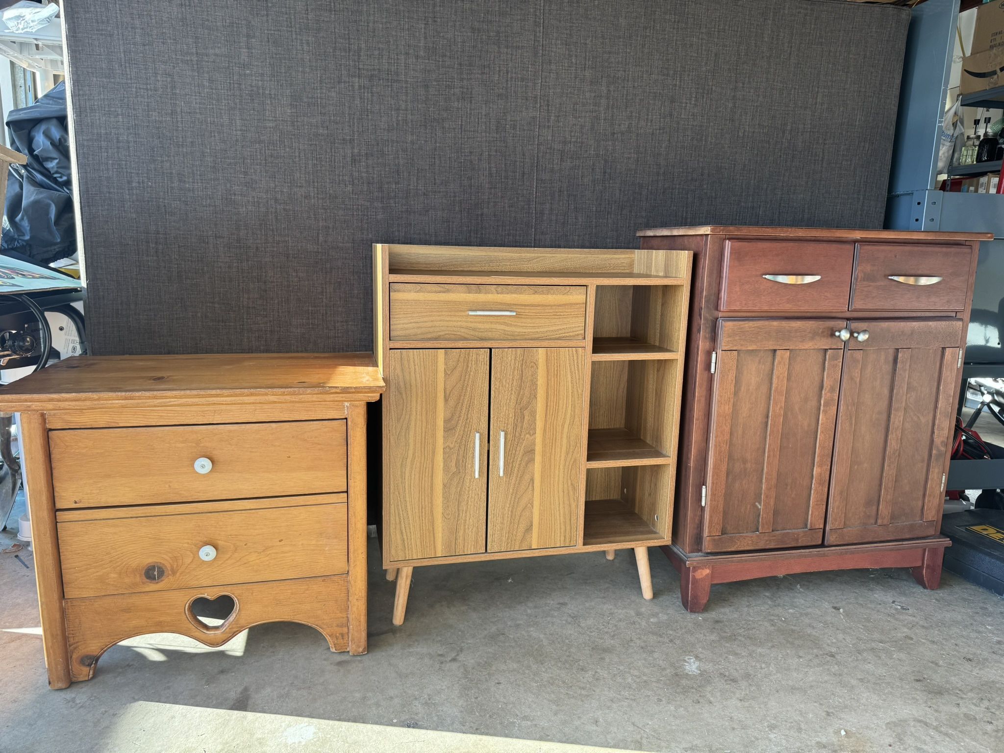 $50 each , OBO Dimensions: Left: 27” l 18” w 23” h Middle: 27” l 12” w 34” h Right: 29” l 16” w 36”.