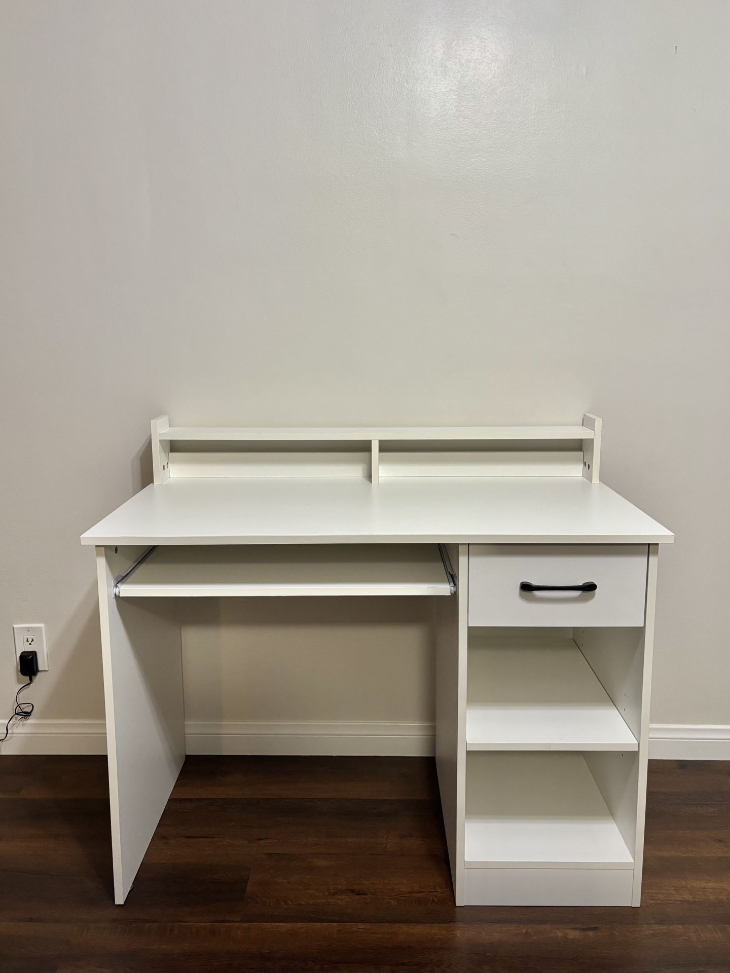 White desk with drawers, storage shelves and keyboard tray. Clean and in great condition. Pick up or can be delivered for a fee.