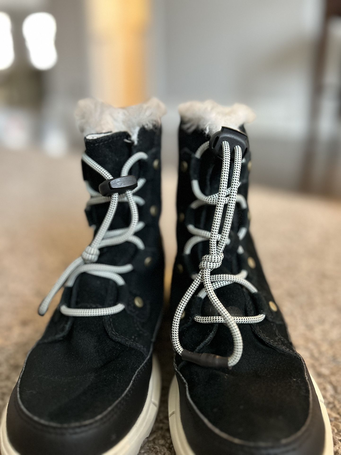 Sorel kids winter boots in great used condition. Black boots with warm faux-fur lining and easy toggle laces. Lightweight but durable — perfect for snow, cold weather, and everyday winter wear. Clean, well cared for, and ready to use. ✔ Warm & comfortable ✔ Easy on/off toggle laces ✔ Trusted Sorel quality Retail price 70-90