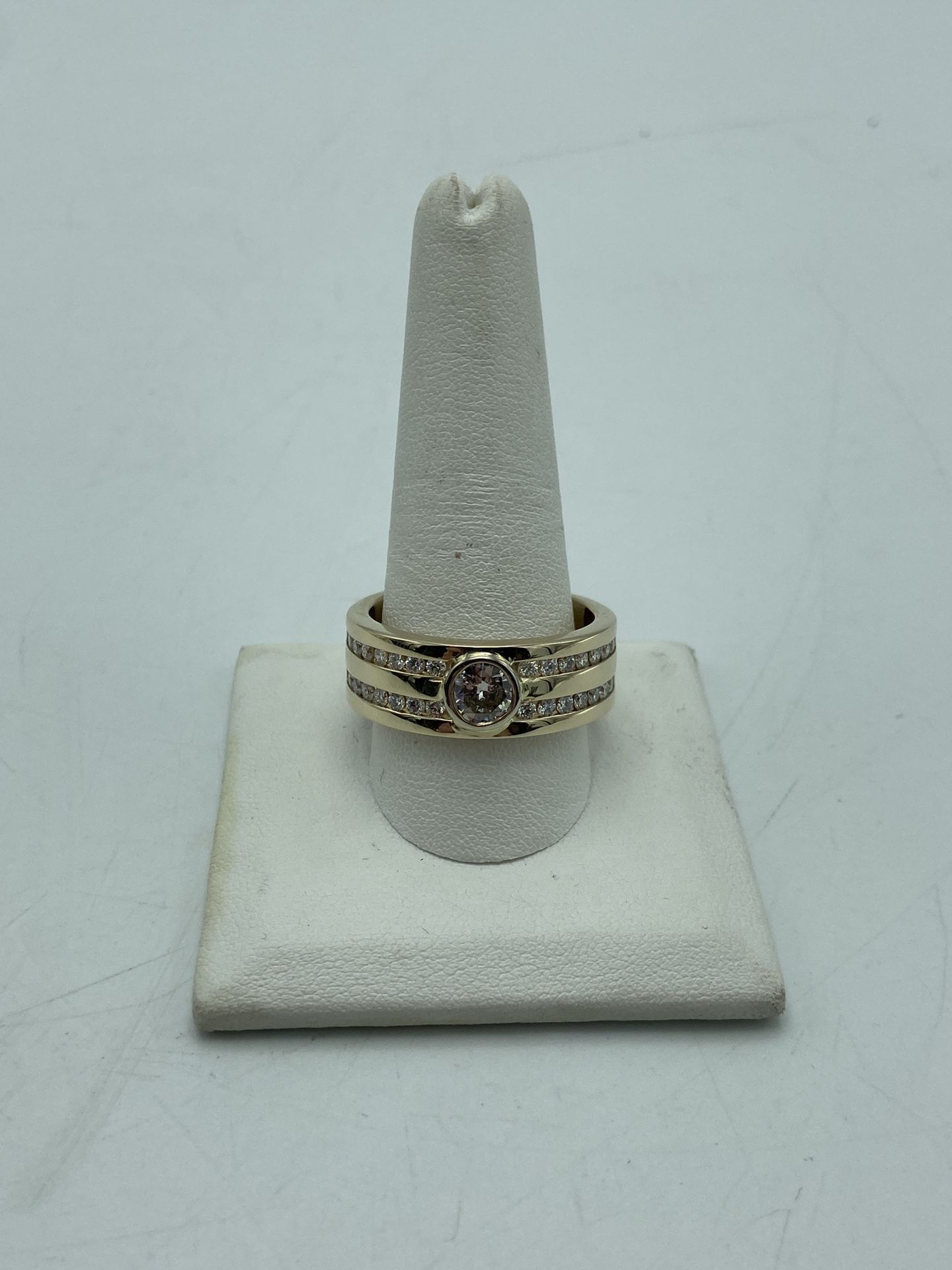 Pre owned in like new condition. This ring is made of 14kt yellow gold and it weighs 20.00 grams. It also contains 1.65 cttw of natural diamonds with a .60ct center. It’s currently a size 13 but we can have it resized for you. Message me with any questions or offers! Pick up only at Sterling and Knight Jewelry and Pawn in Hinsdale.