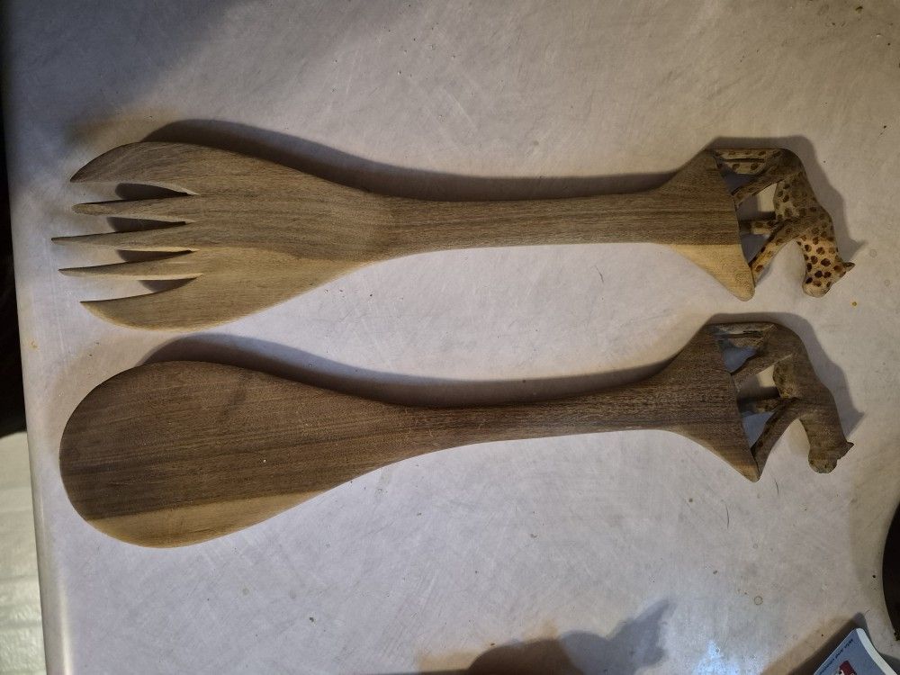 Like new wood hand carved wild cats salad tossing spoon and fork.