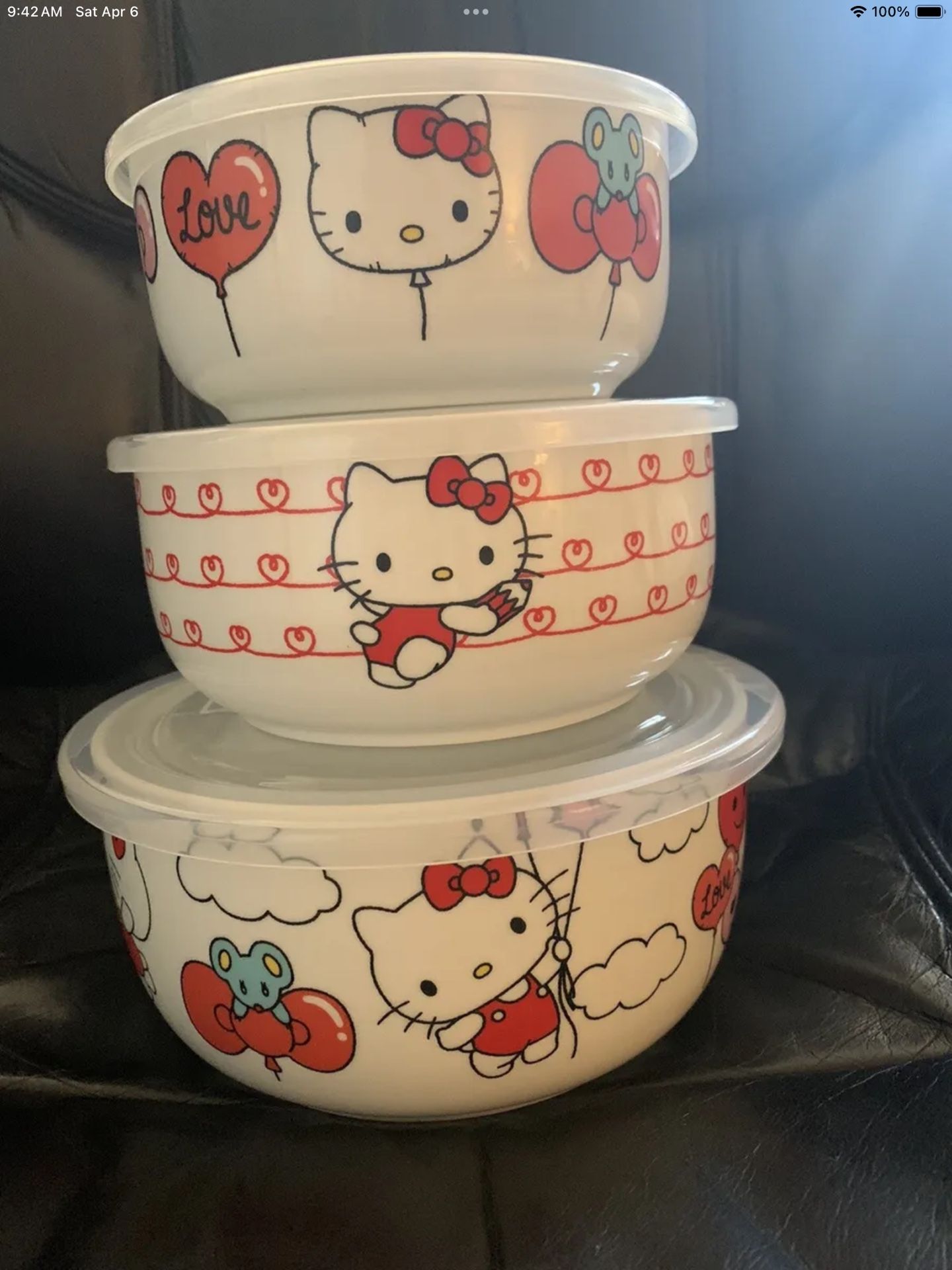 Hello Kitty Sanrio Set Of 3 Ceramic Food Storage Bowls With Vented Lids New