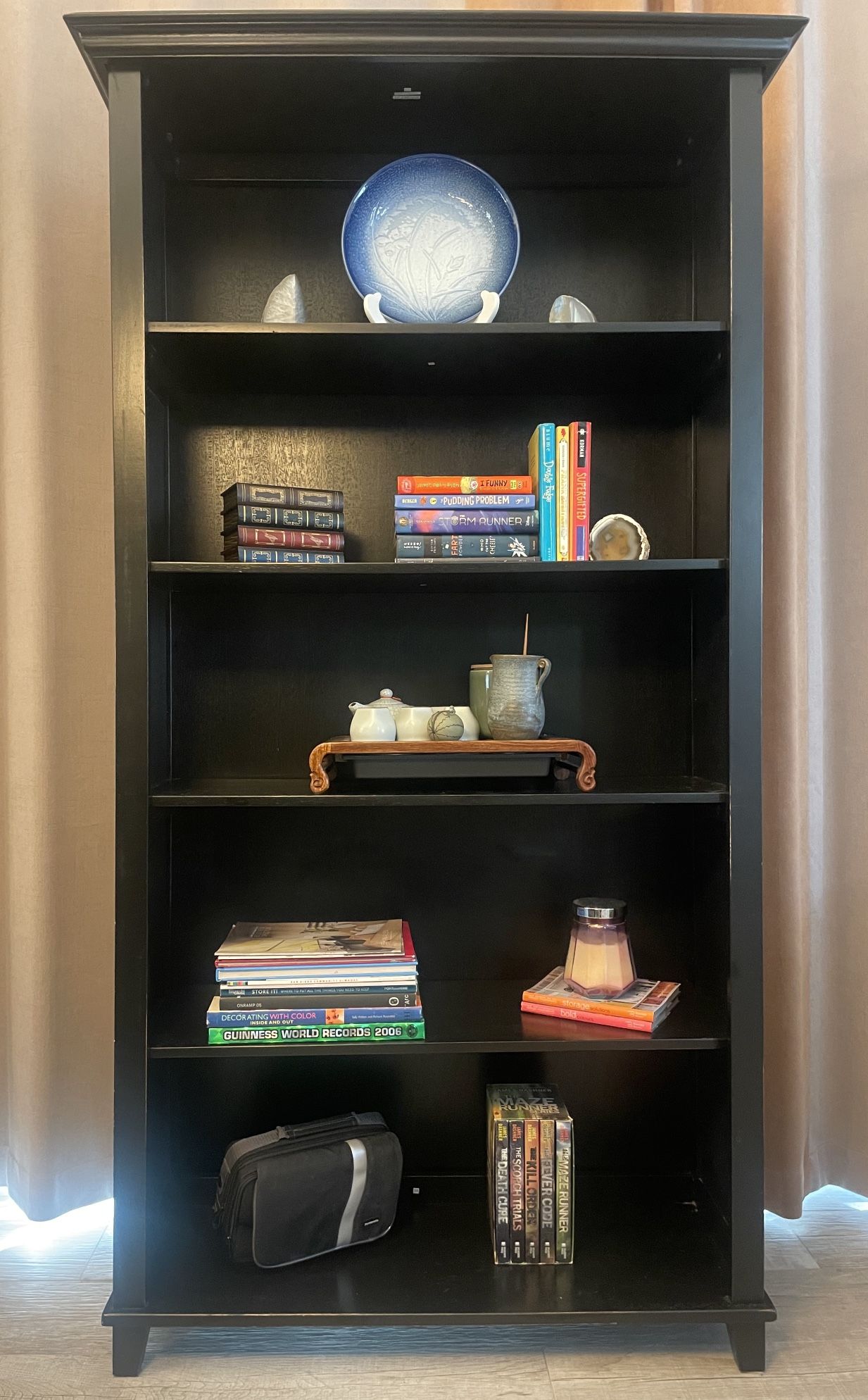 Solid wood bookshelf (39" W x 13" D x 72" H), black color and in excellent condition. Ask $60.