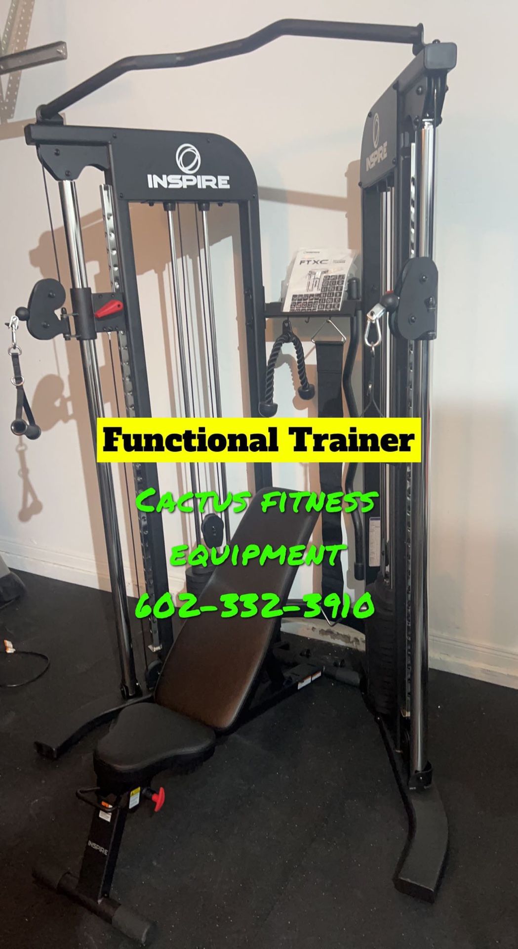 Inspire Fitness FTX Functional Trainer with Bench Includes Folding Adjustable Bench Tricep Rope, 2 Deluxe D Handles, Dip Belt, and Dual Hook Curl Bar Dual Weight Stacks: (15) 10 lb Plates & (1) 15 lb Top Plate Assembly available. Free local delivery. $1080 plus tax