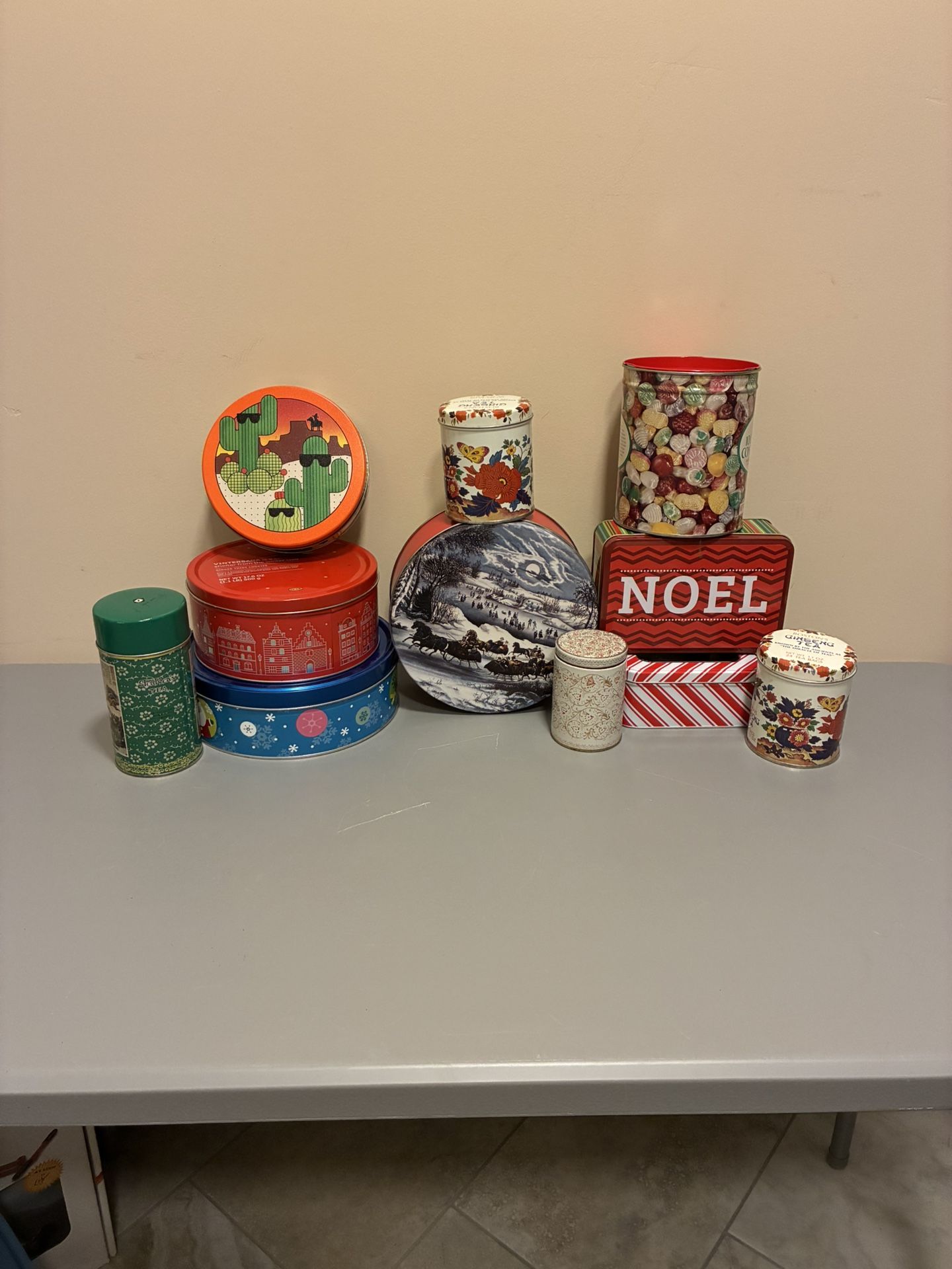 Eleven cans various sized for decoration or storage or cookie exchange/gift.