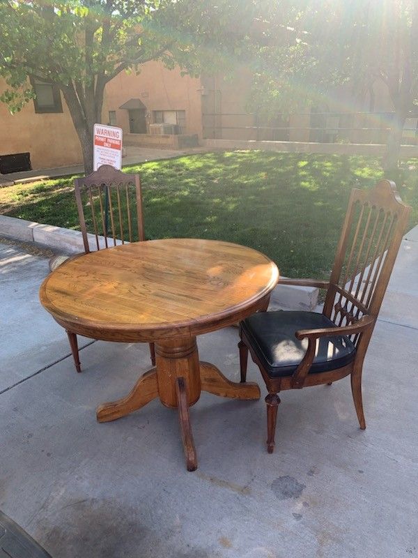 Solid wood. Overall in great sturdy condition. Table has a few small blemishes as shown in the photos that can easily be fixed with a little bit of scratch cover. One of the chairs has a small tear in the seat which has been covered with tape. This is a great starter set perhaps for a college student. local cash or venmo sale only