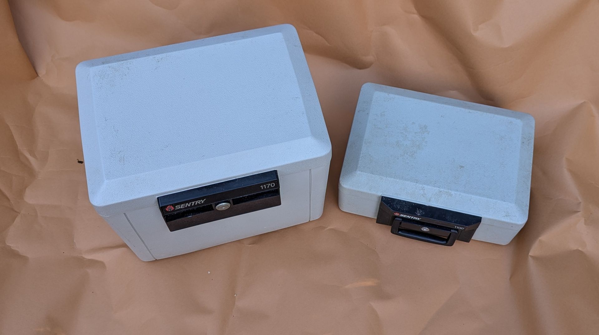 Pick up in Vista California 15 bucks for both Both are fireproof and are in like new condition, handles are great, open and close good can be used as fireproof boxes; but keys are lost, you can use as is or order new keys from Amazon or Sentry. Or you can also just replace the locks all together.