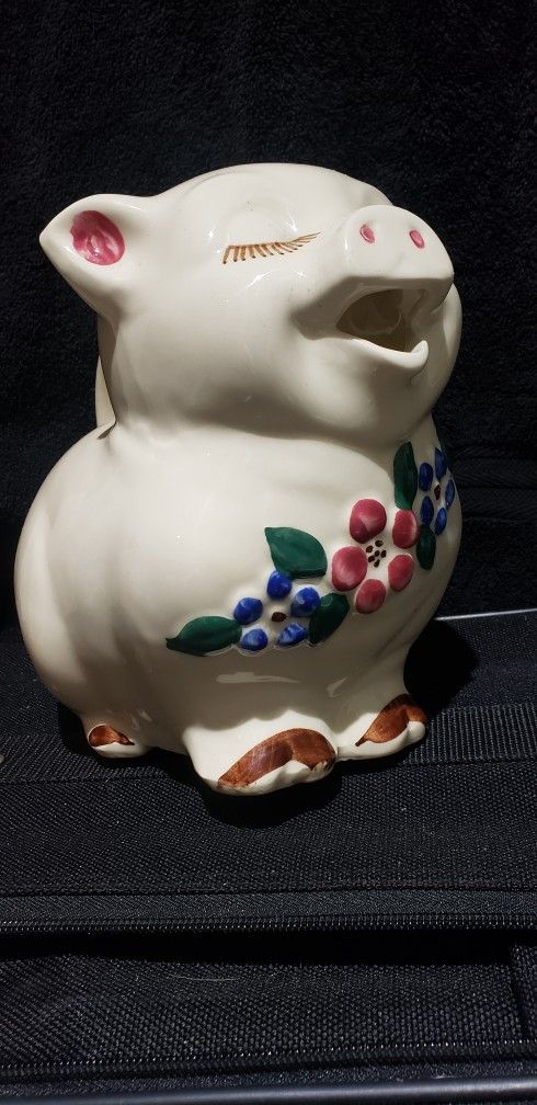 "Smiley the Pig" pitcher. It was produced by the Shawnee Pottery company, which was located in Zanesville, Ohio, and operated between 1937 and 1961. The pitcher is shaped like a smiling pig with closed eyes and features hand-painted, embossed flowers in red, blue, and green. Offered here as pre owned and well taken care of with no damage that we can see.