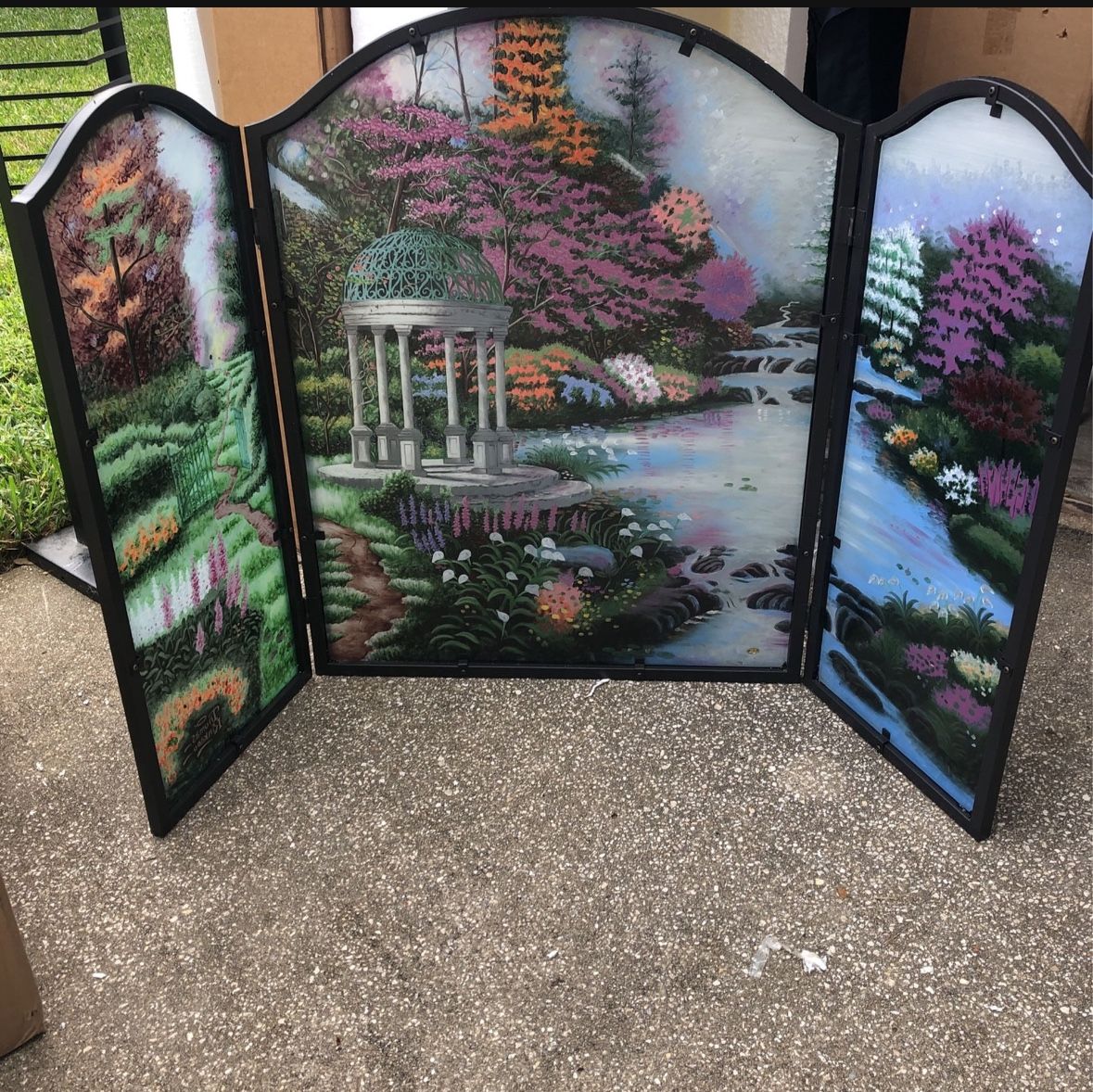 Brand new Thomas Kinkade reverse-painted fireplace screen with light bar
