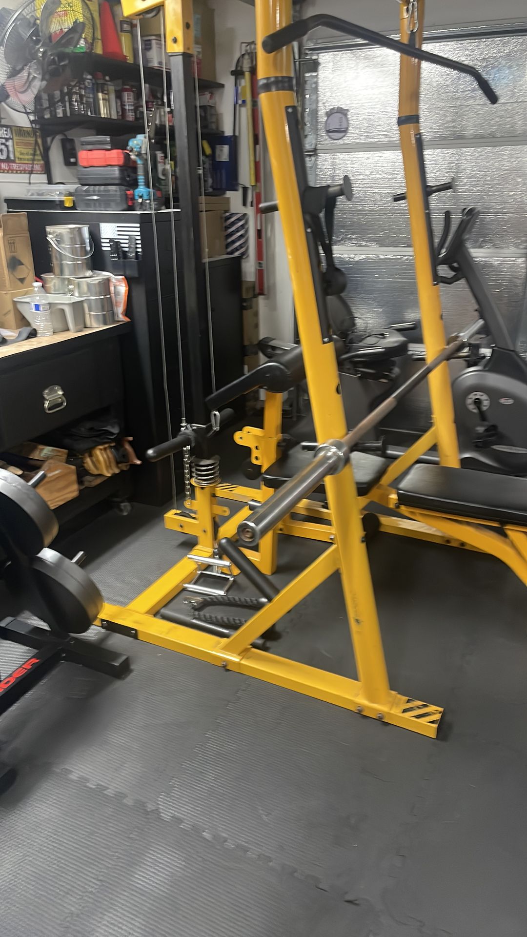 Heavy Duty Cap Stinger squad rack and bench press with bench with leg curl and precher curl attachment.Complete Weider weight plates with Weider weight plate tree. Comes with Olympic bar,bicep bar,Tricep bar, tricep rope,angle back bar.