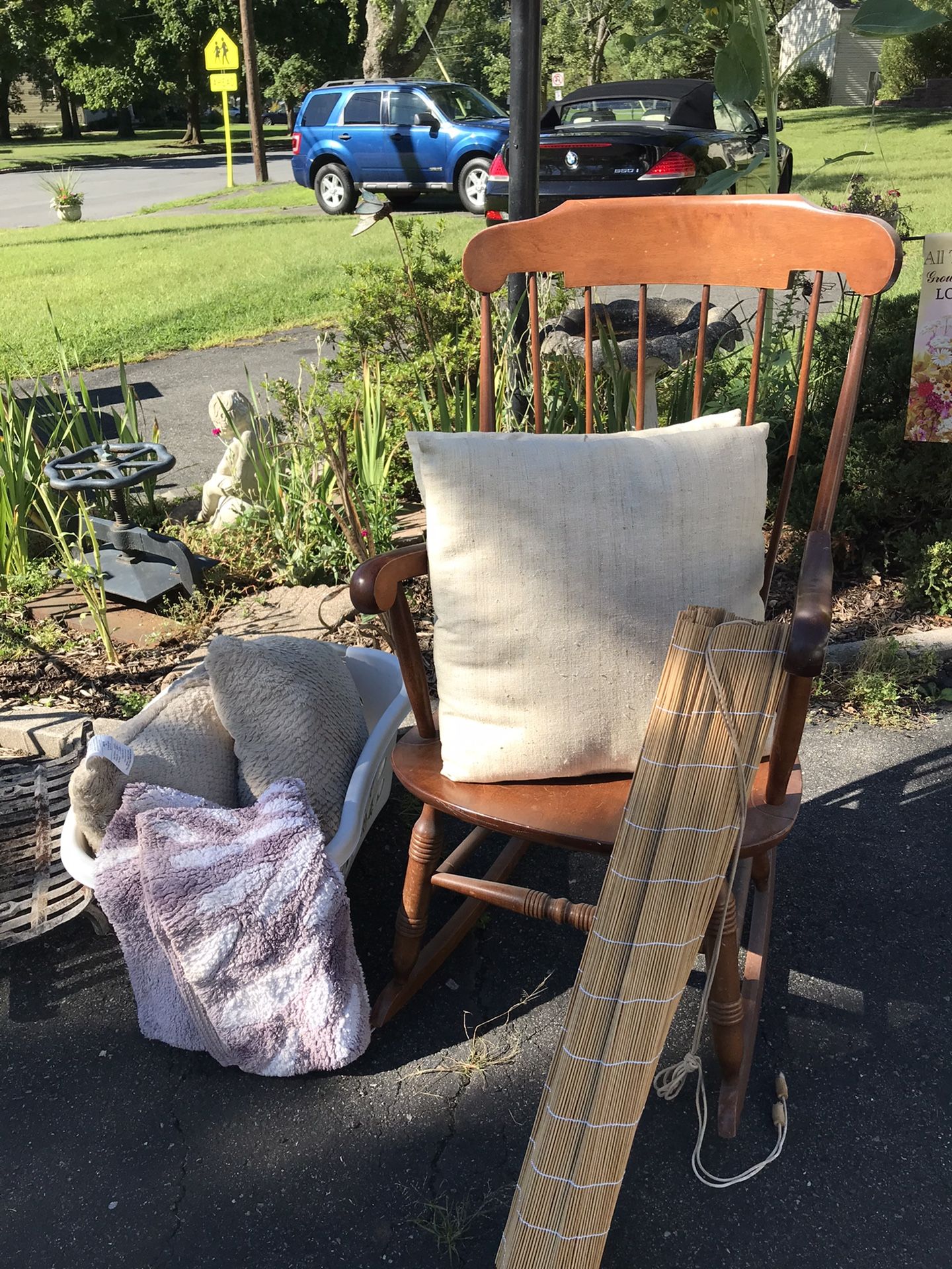 Outdoor dining set wrought iron & metal table with & 4 chairs 600 Original cast iron Fireplace Andiron & log holder ( cast iron)$150 2 Large fireplace screen self standing (foldable ) side lamps , Vintage rocker very good quality stamped makers mark $ 85 Side lamps with newer shades not pic Set of 2 strength wall art - Tuscany Wine theme $10
