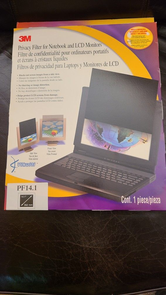 Brand New in original packaging Details: 3M™ Privacy Filters help protect your confidential information from prying eyes which make them ideal for high traffic areas. - PF14.1W fits widescreen notebook computers with a diagonally measured 14.1" viewable screen - Actual filter dimensions are 7 1/2" high x 11 15/16" wide - Reduces glare when used with the matte side - Passersby see only a dark screen making this filter excellent for high traffic areas - Choice of two easy-on, easy-off attachments - Easy to clean - Proudly made in the USA PF14.1W fits widescreen notebook computers with a diagonally measured 14.1" viewable screen Actual filter dimensions are 7 1/2" high x 11 15/16" wide This filter is designed for widescreen notebook computers with screens that appear more rectangular than square have a 16:10 aspect ratio. Also works with and protects fragile LCD screens from scratches and abrasions Utilizes 3M's microlouver privacy technology so only persons directly in front of the monitor can see the image on screen Reversible for either glossy or matte screen finish Lightweight, thin, frameless design Protects display from dirt, debris and scratches Cleans easily with a soft cloth and water Great for high traffic areas such as airports, airplanes, commuter trains, coffee shops and other public places