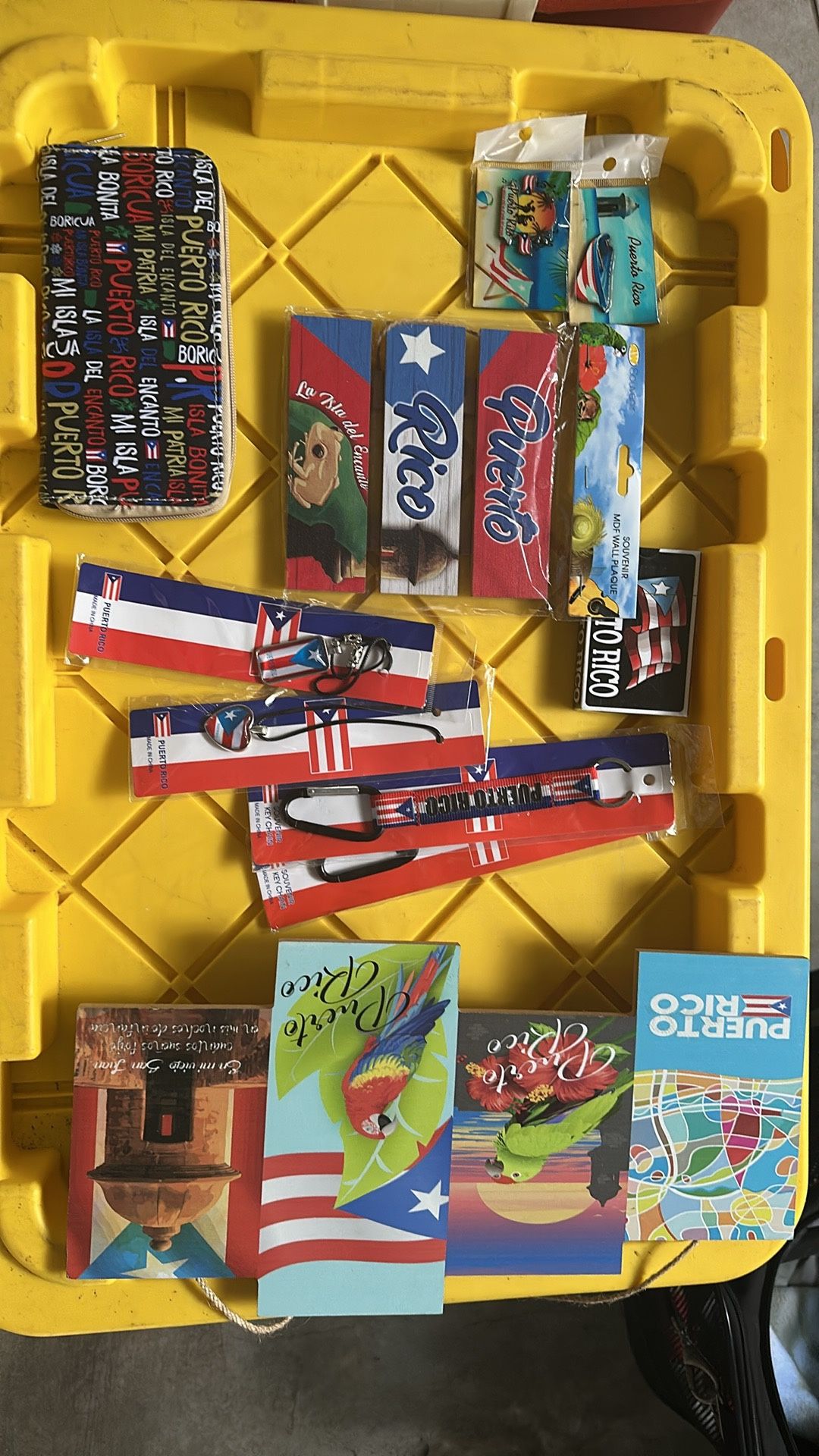 New and used items. Necklace, key chain, deck of cards, wallet, table placemat, Puerto Rico flag, backpack, wall picture. $1