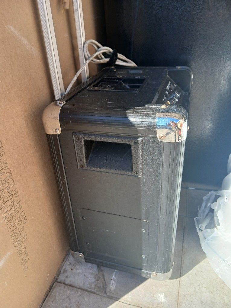 Has old school iPad plugins or auxiliary chord or USB port . Plays all radio stations great lous volume is on wheels has handle to roll it like a suitcase . Has amp knobs