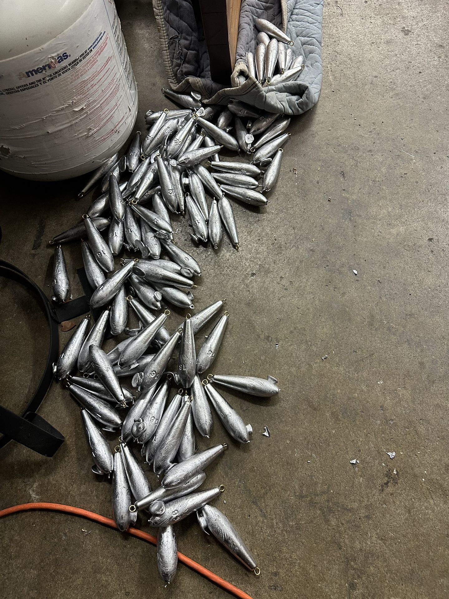Support your local fisherman and lead maker. Prices are firm. Shipping Available or local pick up Available in Packs of 5: Packs 5-16's 25.00 torpedo/cannon 5-12's 20.00 torpedo/cannon 5-10's 17.50 cannon 5-8's 13.00 torpedo/cannon 5-6's 10.00 torpedo 5-5's 9.00 torpedo 5-4's 8.00 torpedo/surf weight 5-3's 7.00 torpedo 2lb bullet sinkers 13.00 each Variety pack for drop shot weights. 1 Pack 12.00 1-2oz 1-1.5oz 1-1oz 1-3/4oz 1-5/8oz 1-1/2oz 1-3/8oz 1-1/4oz 1-1/8oz