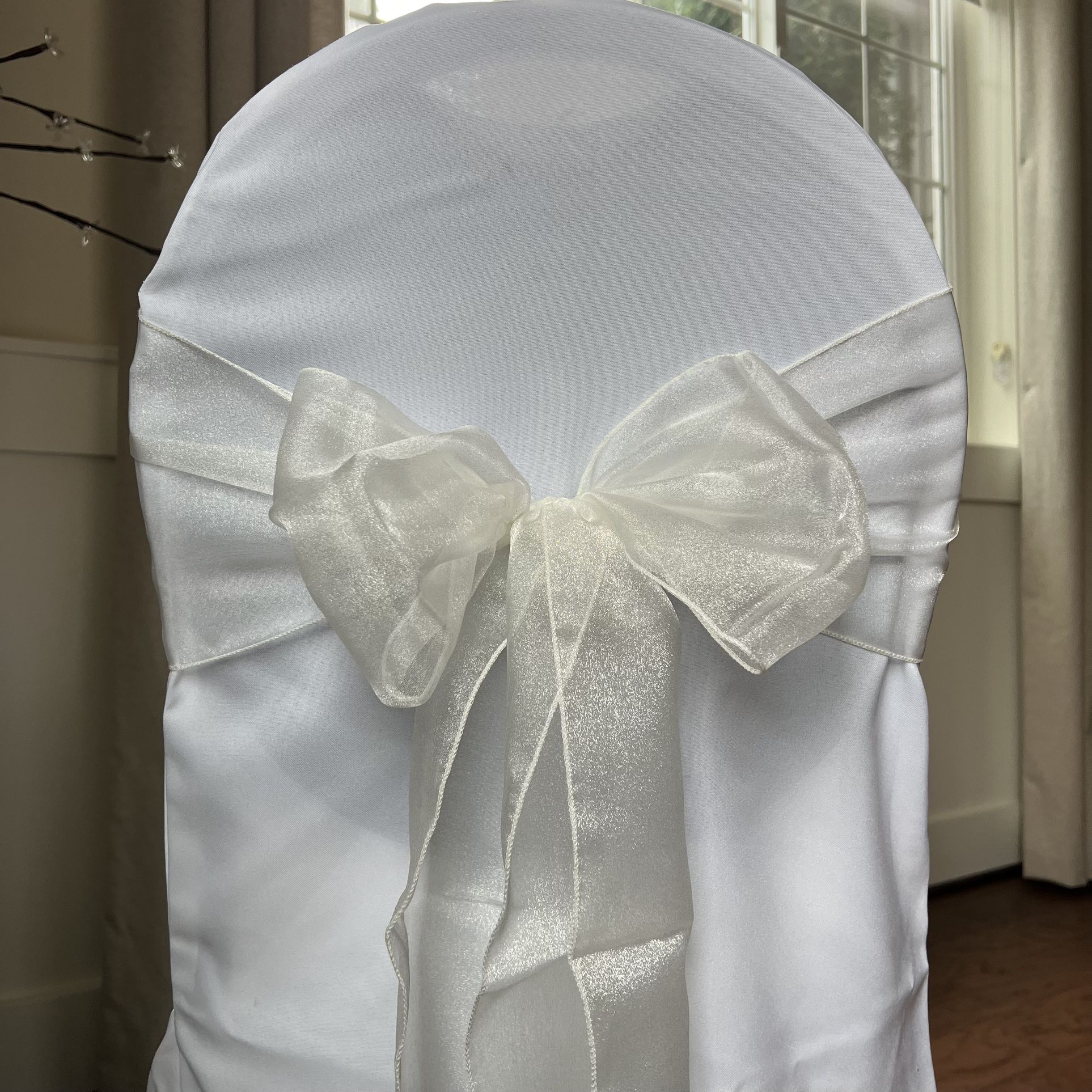 I have more than 300 sashes. $.50 each. You can buy any quantity. Pick up in downtown Bellevue. Cash only. Organza is a sheer/see-through fabric. This listing is for sashes only, no chair covers included. These are 7”x108”. You would have to tie them on the chairs.