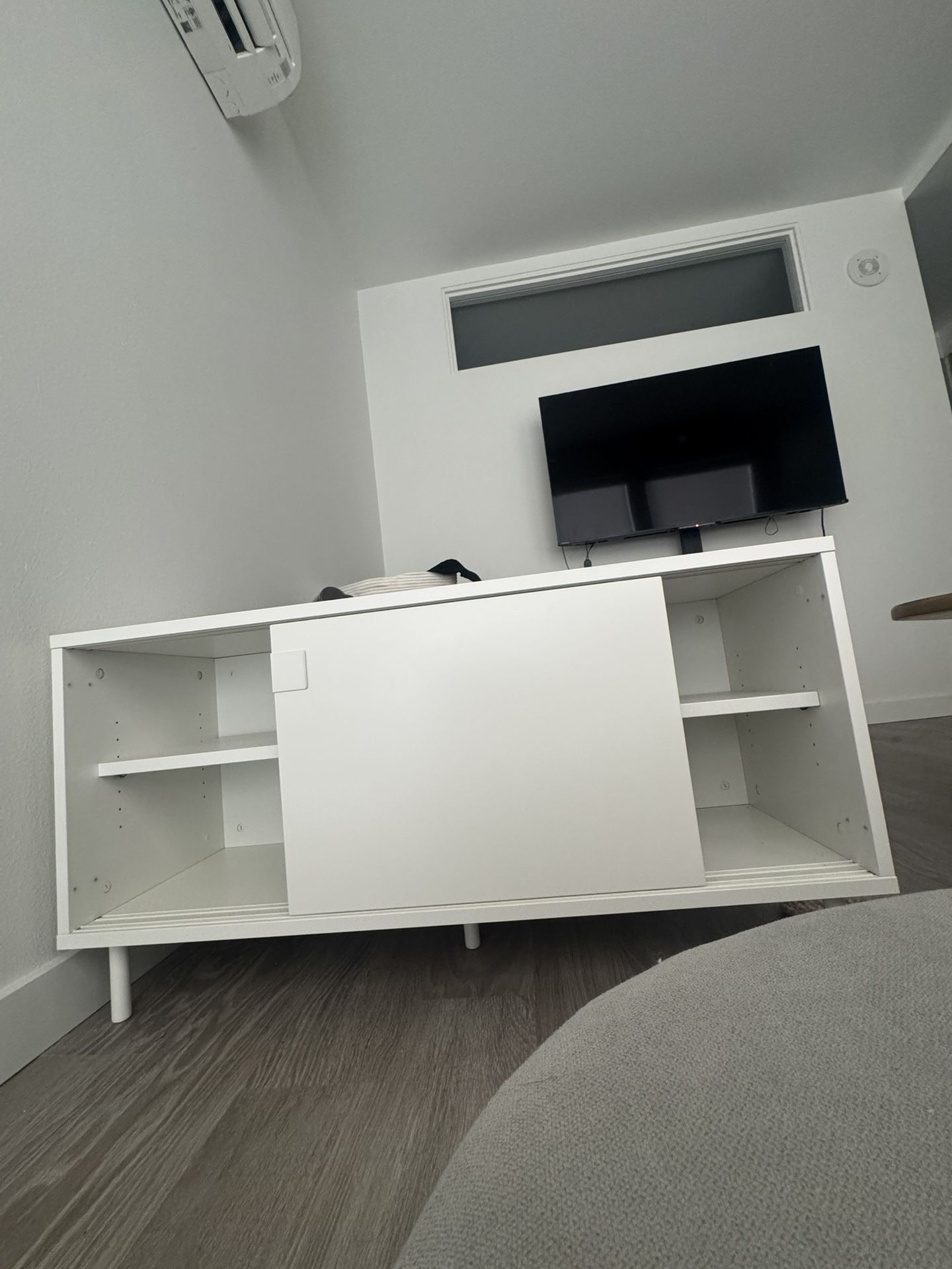 White Bench with Storage, Sliding Doors, Can fit multiple pairs of shoes, can also place cushions on top to sit while putting on/removing shoes. Width: 39 3/8 Depth: 13 3/4 Height: 20 1/8