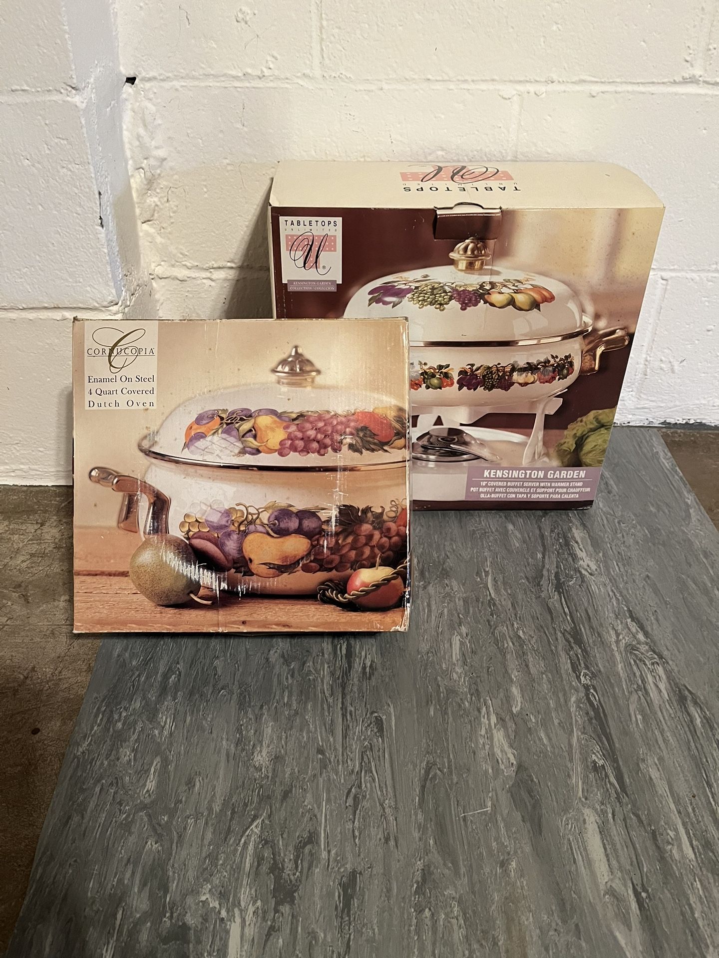 Dutch Oven-4 Qt & Covered Buffet Server w/Warmer Stand-10”. Elegant Fruit Pattern. Never used.