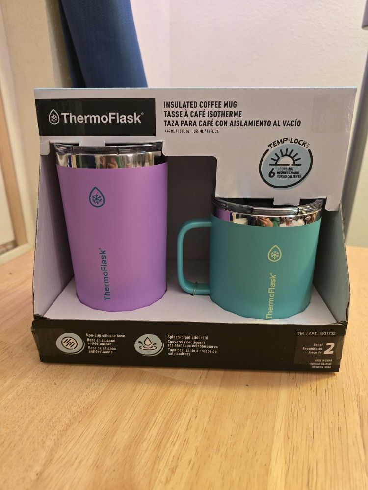 ThermoFlask Stainless Steel Insulated Coffee Mug Set, 2 Pack Pinkish purple/ teal green ThermoFlask insulated coffee mug set. Includes pink and teal mugs. Features Temp-Lock technology. Soda can in picture is for size comparison. New in box.