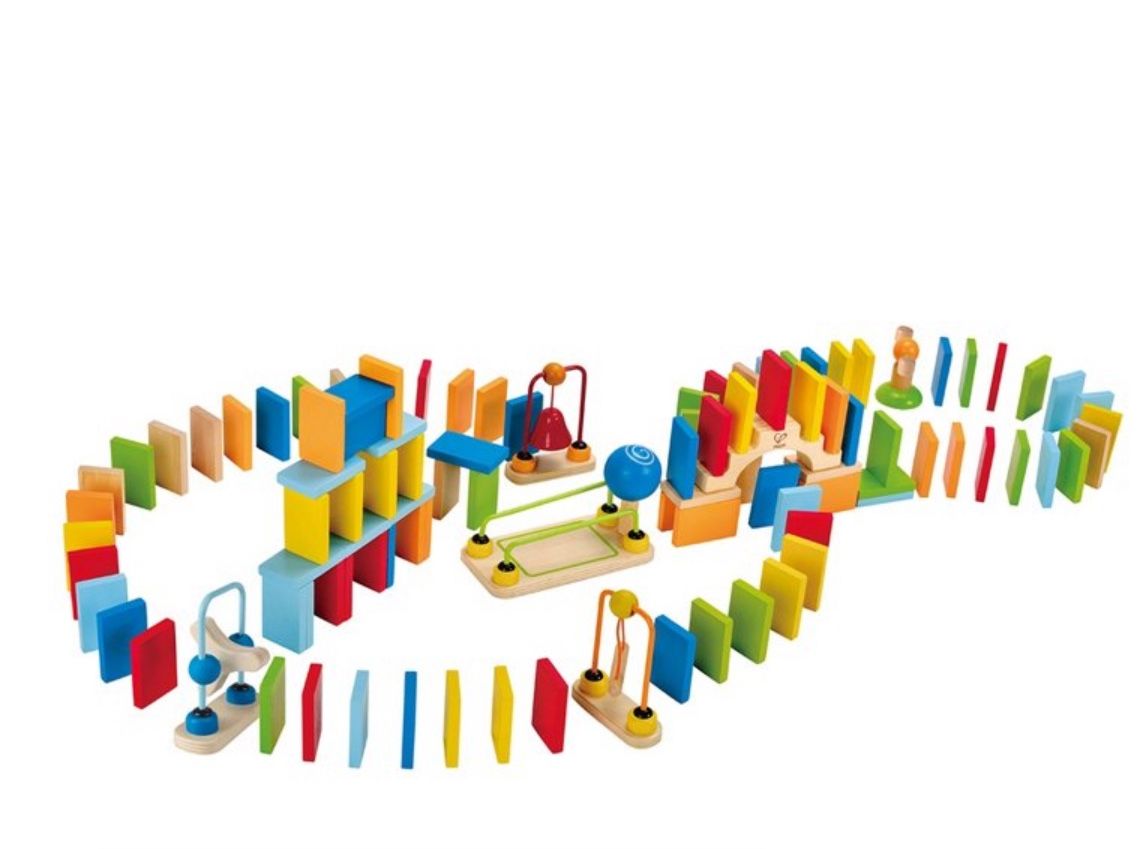 Great condition-Like new *box not included* Brighten playtime with this colorful domino set. Perfect for creative fun and learning. HAPE DYNAMO WOODEN DOMINOES SET - Build a colorful trail of wooden dominoes. Add a bridge, bell, rails, and assorted tricks. Tap one rectangle and watch them all come tumbling down. STEAM value; Science, Technology, Engineering, Arts, & Math: Designed to engage kids in their early STEAM development, the Dynamo Dominoes encourages children’s spatial thinking abilities, 3 dimensional thinking, color recognition and will keep your little engineers coming back for more fun! The specially designed transmitters add more FUN! Special features include a bridge, a bell and assorted tricks that add more fun to the game.
