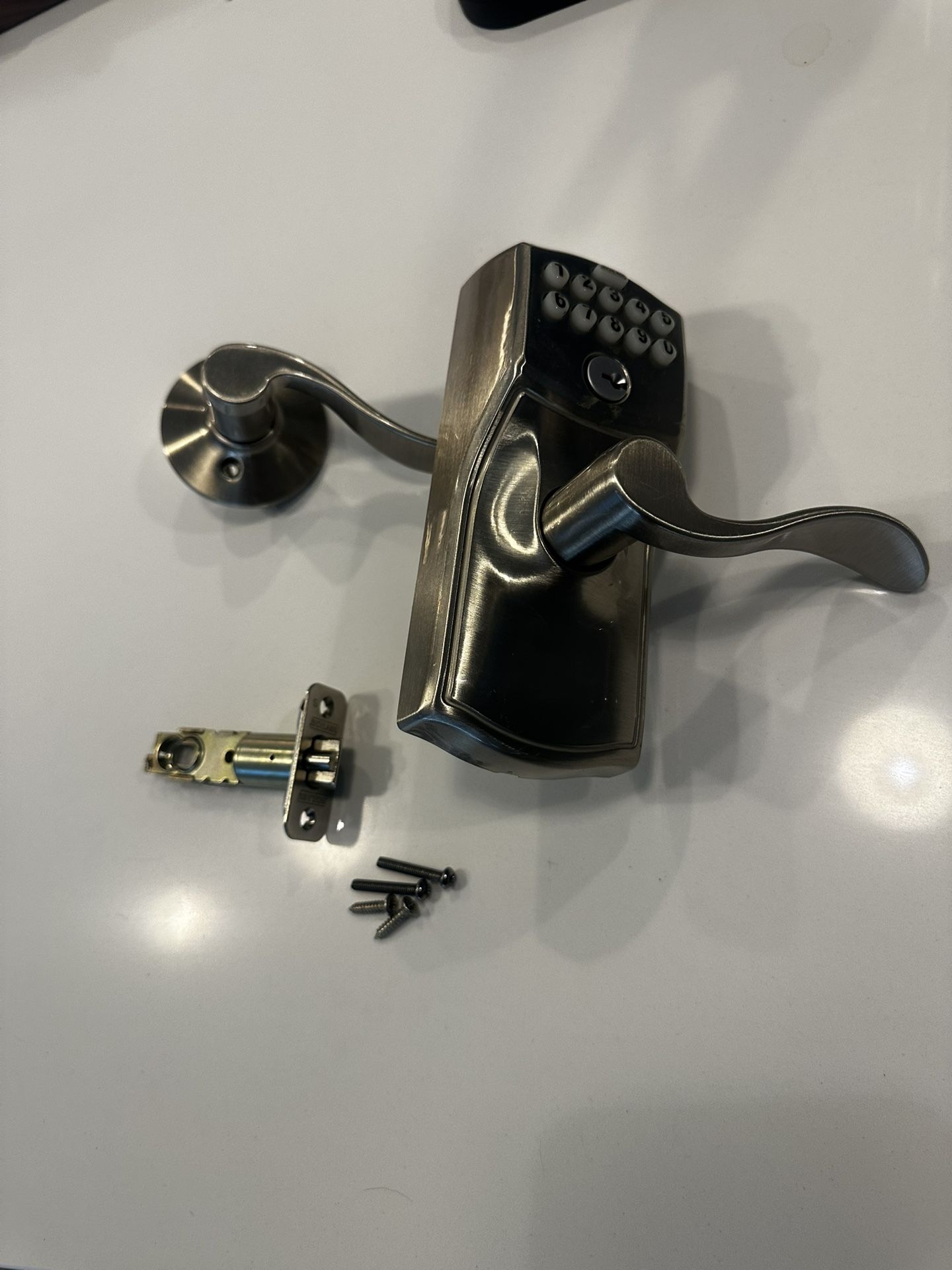 Schlage FE575 CAM 619 ACC Camelot Keypad Lock with Accent Lever, Auto-Lock, Electronic Keyless Entry Color: Satin Nickel Size: 3.01” L x 2.75” W x 6.84” H Link to New/Specs: https://offerup.com/redirect/?o=aHR0cHM6Ly93d3cuYW1hem9uLmNvbS9TY2hsYWdlLUNhbWVsb3QtQXV0by1Mb2NrLUVsZWN0cm9uaWMtS2V5bGVzcy9kcC9CMDAySE1XR1BH