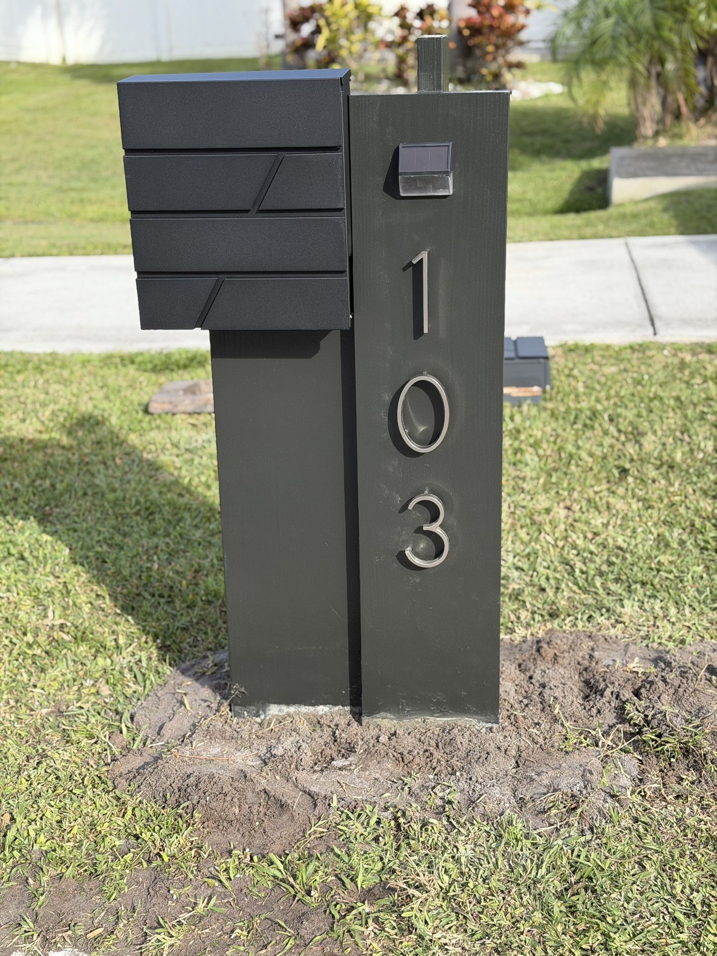 Modern mailbox!!! Stand: treated wood water resistant with primer and exterior paint. Box and nimbers: metal and stainless steel