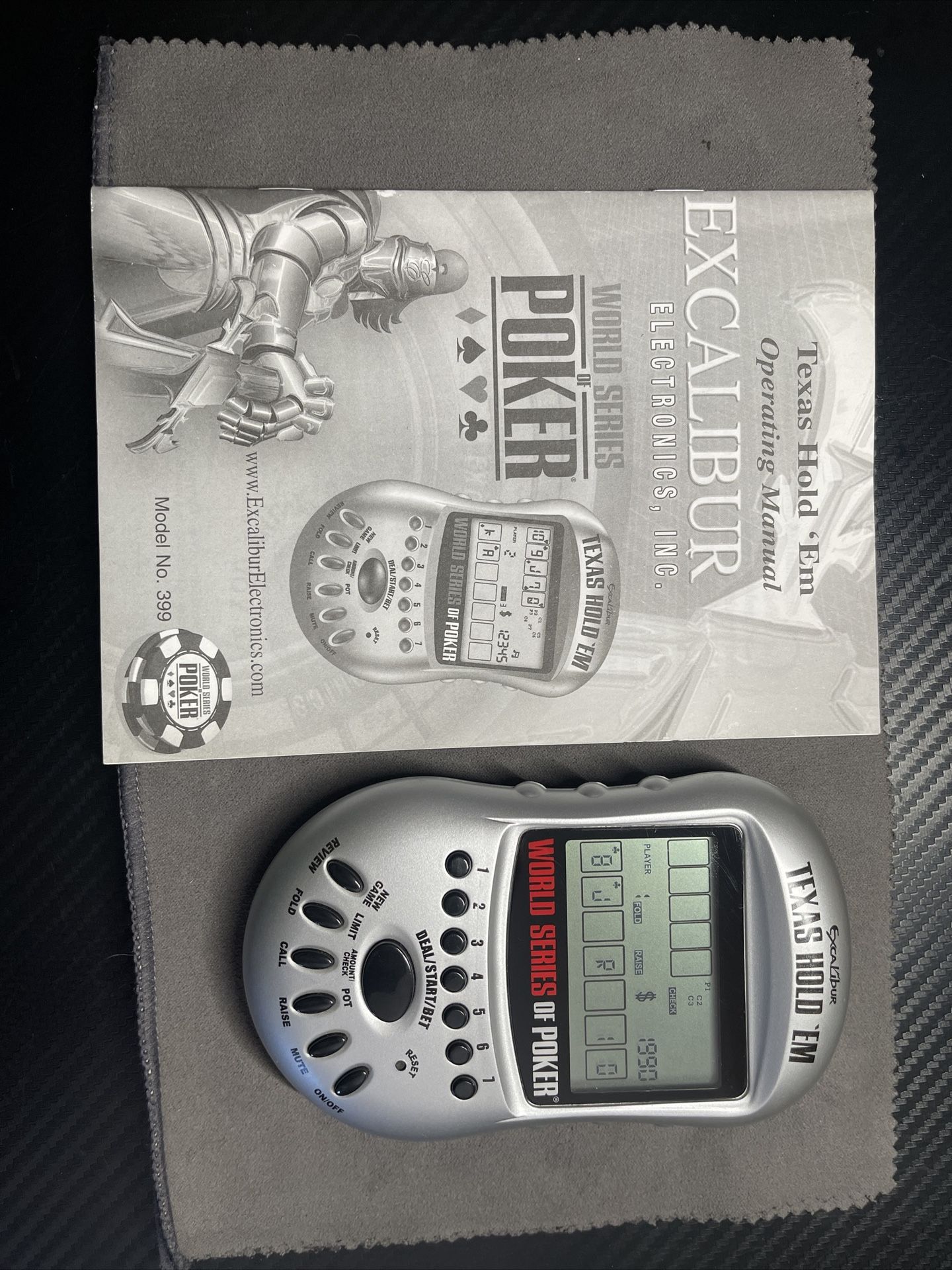 Excalibur "Texas Hold Em" World Series Of Poker, Electronic Handheld Game, 2-AAA batteries included. This game is in very good preowned condition, has been tested and works. Thanks for looking.