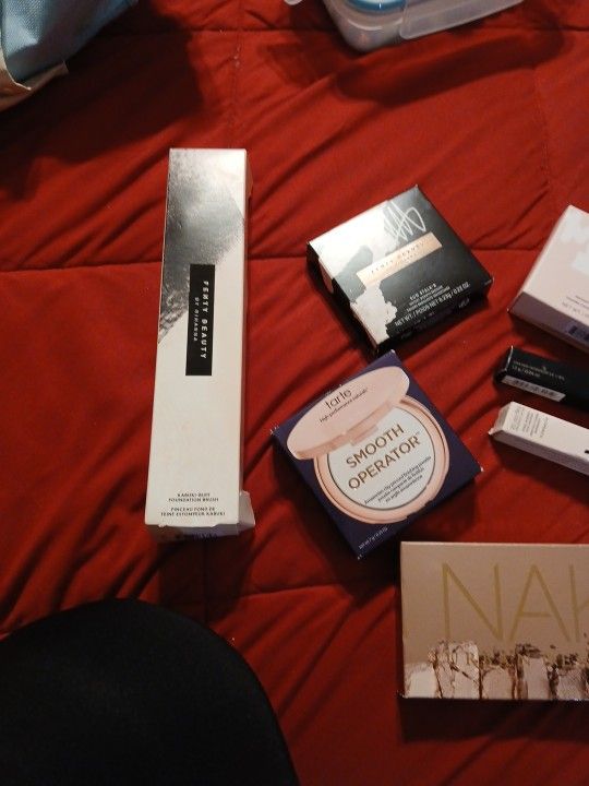 1. Fenty beauty Kabuki-buff foundation brush 20$ 2.fenty Beauty Pro Filt'r color is 410 soft matte powder foundation 20$ 3. Fenty beauty instant warmth bronzer island ting 04 - 20$ 4 . NAKED 3 URBAN DECAY eyeshadow pallet 40$ 5 TARTE smooth operator finishing powder translucent 20$