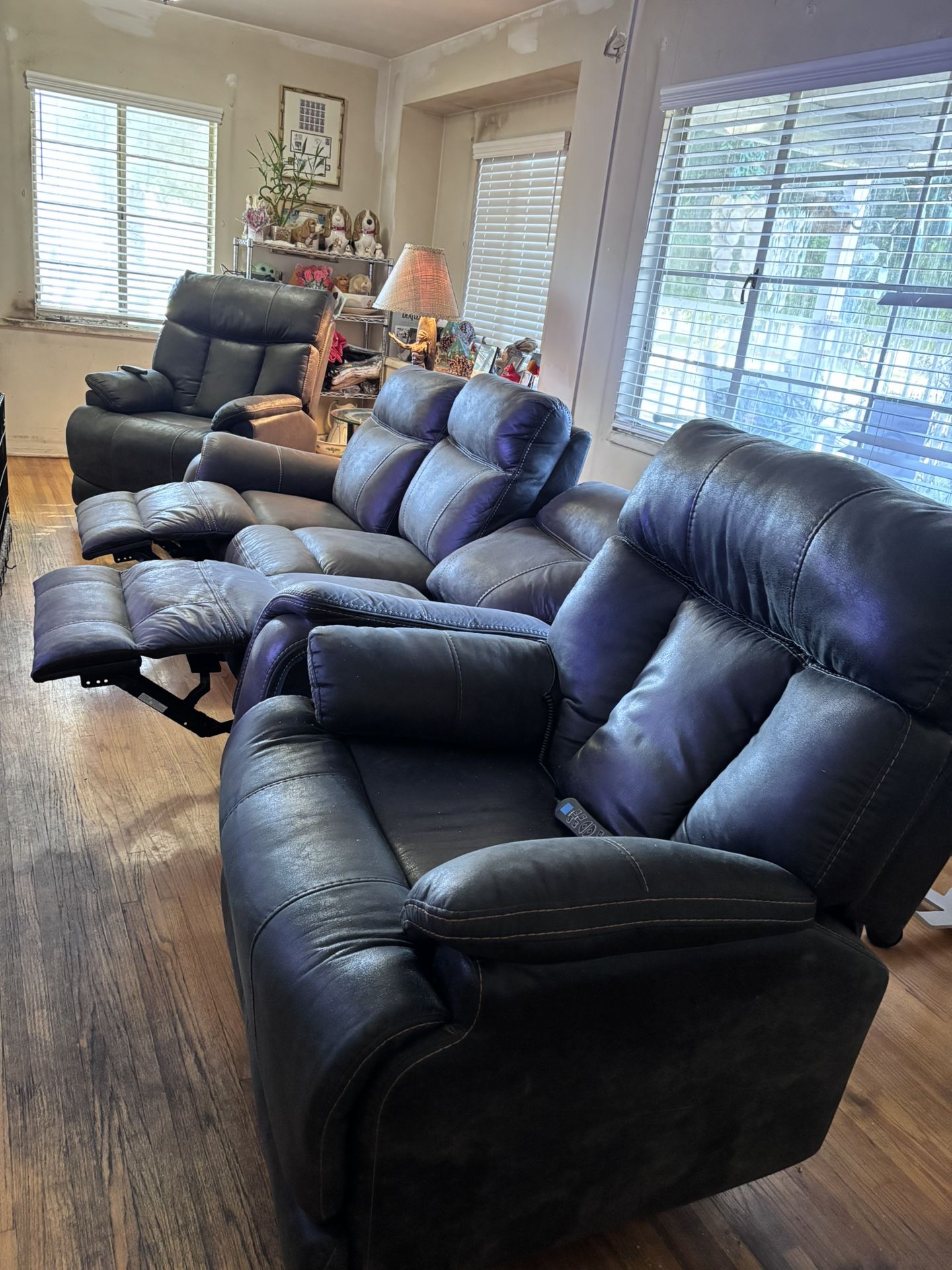 Three piece set. Couch +2 recliners. Legs of the couch go up on the two end seats. Recliners have remotes and go very vertical if you need help getting out out of the seat. Set is approximately three years old. Looking to sell this weekend by March 15. Make an offer! Dark blue/gray color. Great condition and easy to clean.